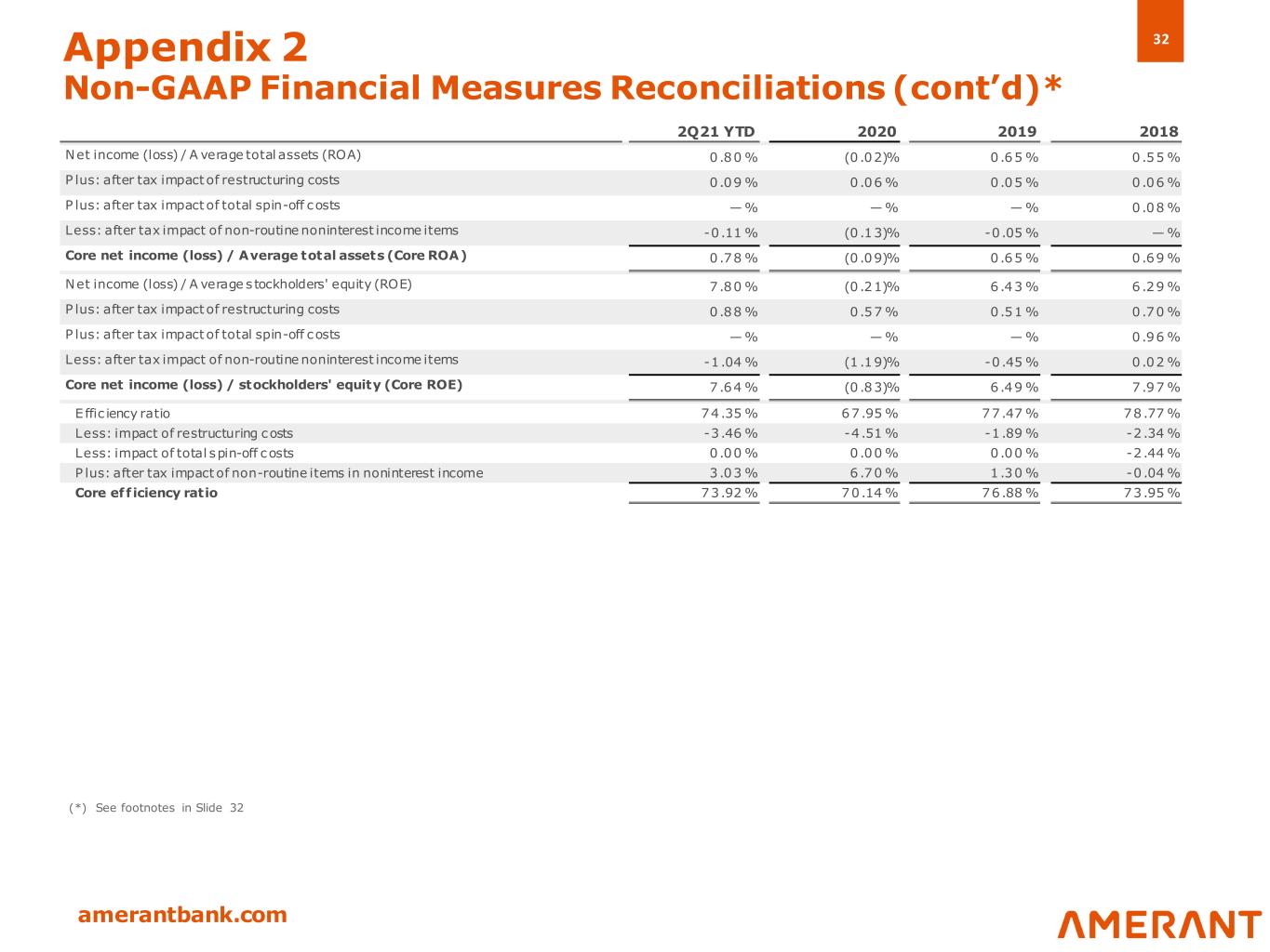 31 amerantbank.com (in thousands) 2Q21 YTD 2020 2019 2018 Net income (loss) attributable to Amerant Bancorp Inc. $ 30,421 $ (1,722) $ 51,334 $ 45,833 P lus after-tax restructuring costs: Res tructuring costs before income tax effect 4 ,404 11,925 5,046 6,395 Income tax effect (945) (7 ,187) (1 ,001) (1,303) Total after-tax restructuring costs 3,459 4,738 4,045 5,092 P lus after-tax total Spin-off costs: Total Spin-off costs before income tax effect — — — 6,667 Income tax effect (5) — — — 331 Total after-tax Spin-off costs — — — 6,998 Less before-tax non-routine items in noninterest income (5,209) (25,188) (4 ,514) 117 Income tax effect 1,117 15,181 895 (24) Total after-tax non-routine items in noninterest income (4,092) (10,007) (3 ,619) 93 Core net income (loss) $ 29,788 $ (6,991) $ 51,760 $ 58,016 Bas ic earnings (loss) per share $ 0.81 $ (0.04) $ 1.21 $ 1.08 P lus: after tax impact of restructuring costs 0.10 0.11 0.09 0.12 P lus: after tax impact of total spin-off costs — — — 0.16 Less: after tax impact of non-routine noninterest income items (0 .12) (0 .24) (0 .08) — Total core basic earnings per common share $ 0.79 $ (0.17) $ 1.22 $ 1.36 Diluted earnings (loss) per share (6) $ 0.81 $ (0.04) $ 1.20 $ 1.08 P lus: after tax impact of restructuring costs 0 .09 0.11 0.09 0.12 P lus: after tax impact of total spin-off costs — — — 0.16 Less: after tax impact of non-routine noninterest income items (0 .11) (0 .24) (0.08) — Total core diluted earnings per common share $ 0.79 $ (0.17) $ 1.21 $ 1.36 Appendix 2 Non-GAAP Financial Measures Reconciliations (cont’d)* (*) See footnotes in Slide 32