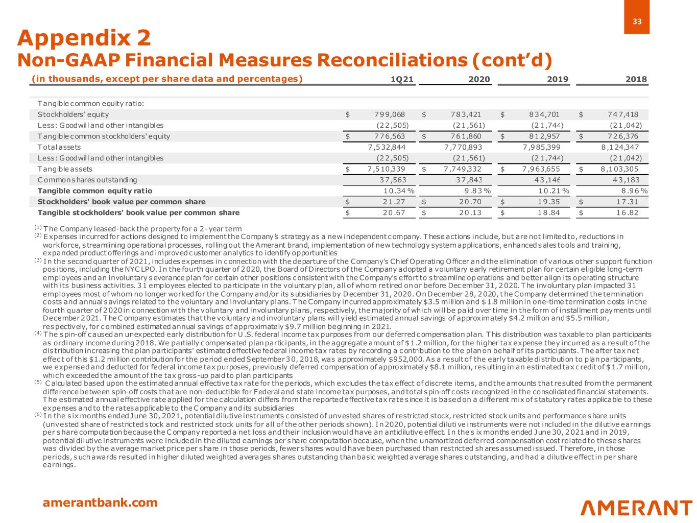 33 amerantbank.com Appendix 2 Non-GAAP Financial Measures Reconciliations (cont’d) (in thousands, except per share data and percentages) 1Q21 2020 2019 2018 Tangible common equity ratio: Stockholders' equity $ 799,068 $ 783,421 $ 834,701 $ 747,418 Less: Goodwill and other intangibles (22,505) (21,561) (21,744) (21,042) Tangible common stockholders' equity $ 776,563 $ 761,860 $ 812,957 $ 726,376 Total assets 7,532,844 7,770,893 7,985,399 8,124,347 Less: Goodwill and other intangibles (22,505) (21,561) (21,744) (21,042) Tangible assets $ 7,510,339 $ 7,749,332 $ 7,963,655 $ 8,103,305 C ommon shares outstanding 37,563 37,843 43,146 43,183 Tangible common equity ratio 10.34 % 9.83 % 10.21 % 8.96 % Stockholders' book value per common share $ 21.27 $ 20.70 $ 19.35 $ 17.31 Tangible stockholders' book value per common share $ 20.67 $ 20.13 $ 18.84 $ 16.82 (1) The Company leased-back the property for a 2-year term (2) Expenses incurred for actions designed to implement the Company’s strategy as a new independent company. These actions include, but are not limited to, reductions in workforce, s treamlining operational processes, rolling out the Amerant brand, implementation of new technology system applications, enhanced sales tools and training, expanded product offerings and improved customer analytics to identify opportunities (3) In the second quarter of 2021, includes expenses in connection with the departure of the Company's Chief Operating Officer and the elimination of various other support function pos itions, including the NYC LPO. In the fourth quarter of 2020, the Board of Directors of the Company adopted a voluntary early retirement plan for certain eligible long-term employees and an involuntary severance plan for certain other positions consistent with the Company's effort to s treamline operations and better align its operating structure with its business activities. 31 employees elected to participate in the voluntary plan, all of whom retired on or before December 31, 2020. The involuntary plan impacted 31 employees most of whom no longer worked for the Company and/or its subsidiaries by December 31, 2020. On December 28, 2020, t he Company determined the termination costs and annual savings related to the voluntary and involuntary plans. The Company incurred approximately $3.5 million and $1.8 million in one-time termination costs in the fourth quarter of 2020 in connection with the voluntary and involuntary plans, respectively, the majority of which will be pa id over time in the form of installment payments until December 2021. The C ompany estimates that the voluntary and involuntary plans will yield estimated annual savings of approximately $4.2 million and $5.5 million, respectively, for combined estimated annual savings of approximately $9.7 million beginning in 2021. (4) The spin-off caused an unexpected early distribution for U .S. federal income tax purposes from our deferred compensation plan. This distribution was taxable to plan participants as ordinary income during 2018. We partially compensated plan participants, in the aggregate amount of $1.2 million, for the higher tax expense they incurred as a result of the dis tribution increasing the plan participants' estimated effective federal income tax rates by recording a contribution to the plan on behalf of its participants. The after tax net effec t of this $1.2 million contribution for the period ended September 30, 2018, was approximately $952,000. As a result of the early taxable distribution to plan participants, we expensed and deducted for federal income tax purposes, previously deferred compensation of approximately $8.1 million, resulting in an estimated tax c redit of $1.7 million, which exceeded the amount of the tax gross-up paid to plan participants (5) C alculated based upon the estimated annual effective tax rate for the periods, which excludes the tax effect of discrete items, and the amounts that resulted from the permanent difference between spin-off costs that are non-deductible for Federal and state income tax purposes, and total spin-off costs recognized in the consolidated financial statements. The estimated annual effective rate applied for the calculation differs from the reported effective tax rate s ince it is based on a different mix of s tatutory rates applicable to these expenses and to the rates applicable to the C ompany and its subsidiaries (6) In the s ix months ended June 30, 2021, potential dilutive instruments consisted of unvested shares of restricted stock, restr icted stock units and performance share units (unvested share of restricted s tock and restricted stock units for all of the other periods shown). In 2020, potential diluti ve instruments were not included in the dilutive earnings per share computation because the C ompany reported a net loss and their inclusion would have an antidilutive effect. In the s ix months ended June 30, 2021 and in 2019, potential dilutive instruments were included in the diluted earnings per share computation because, when the unamortized deferred compensation cost related to these shares was divided by the average market price per share in those periods, fewer shares would have been purchased than restricted shares assumed issued. Therefore, in those periods, such awards resulted in higher diluted weighted averages shares outstanding than basic weighted average shares outstanding, and had a dilutive effect in per share earnings.