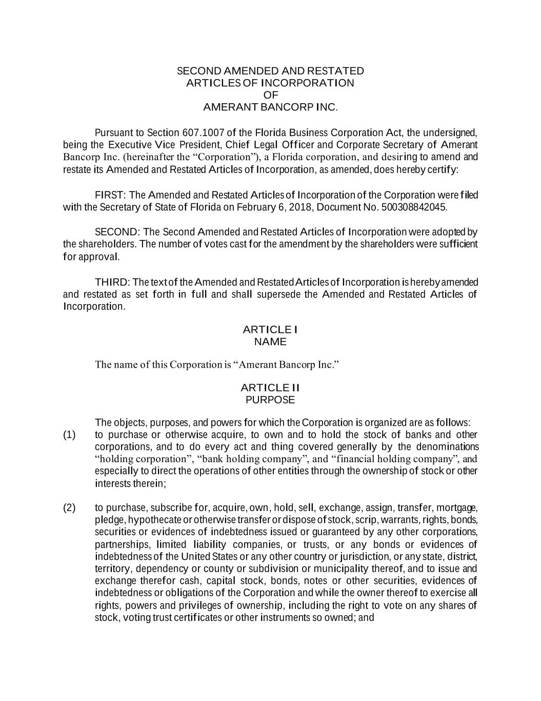 SECOND AMENDED AND RESTATED ARTICLES OF INCORPORATION OF AMERANT BANCORP INC. Pursuant to Section 607.1007 of the Florida Business Corporation Act, the undersigned, being the Executive Vice President, Chief Legal Officer and Corporate Secretary of Amerant Bancorp Inc. (hereinafter the “Corporation”), a Florida corporation, and desir ing to amend and restate its Amended and Restated Articles of Incorporation, as amended, does hereby certify: FIRST: The Amended and Restated Articles of Incorporation of the Corporation were filed with the Secretary of State of Florida on February 6, 2018, Document No. 500308842045. SECOND: The Second Amended and Restated Articles of Incorporation were adopted by the shareholders. The number of votes cast for the amendment by the shareholders were sufficient for approval. THIRD: The text of the Amended and Restated Articles of Incorporation is hereby amended and restated as set forth in full and shall supersede the Amended and Restated Articles of Incorporation. ARTICLE I NAME The name of this Corporation is “Amerant Bancorp Inc.” ARTICLE II PURPOSE The objects, purposes, and powers for which the Corporation is organized are as follows: (1) to purchase or otherwise acquire, to own and to hold the stock of banks and other corporations, and to do every act and thing covered generally by the denominations “holding corporation”, “bank holding company”, and “financial holding company”, and especially to direct the operations of other entities through the ownership of stock or other interests therein; (2) to purchase, subscribe for, acquire, own, hold, sell, exchange, assign, transfer, mortgage, pledge, hypothecate or otherwise transfer or dispose of stock, scrip, warrants, rights, bonds, securities or evidences of indebtedness issued or guaranteed by any other corporations, partnerships, limited liability companies, or trusts, or any bonds or evidences of indebtedness of the United States or any other country or jurisdiction, or any state, district, territory, dependency or county or subdivision or municipality thereof, and to issue and exchange therefor cash, capital stock, bonds, notes or other securities, evidences of indebtedness or obligations of the Corporation and while the owner thereof to exercise all rights, powers and privileges of ownership, including the right to vote on any shares of stock, voting trust certificates or other instruments so owned; and