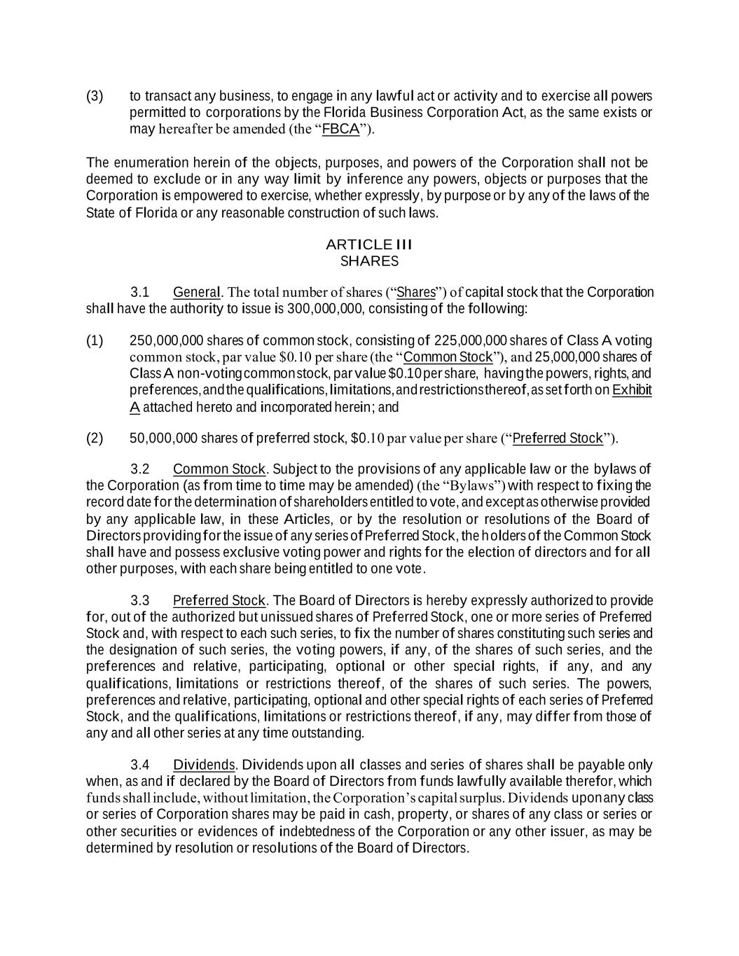 (3) to transact any business, to engage in any lawful act or activity and to exercise all powers permitted to corporations by the Florida Business Corporation Act, as the same exists or may hereafter be amended (the “FBCA”). The enumeration herein of the objects, purposes, and powers of the Corporation shall not be deemed to exclude or in any way limit by inference any powers, objects or purposes that the Corporation is empowered to exercise, whether expressly, by purpose or by any of the laws of the State of Florida or any reasonable construction of such laws. ARTICLE III SHARES 3.1 General. The total number of shares (“Shares”) of capital stock that the Corporation shall have the authority to issue is 300,000,000, consisting of the following: (1) 250,000,000 shares of common stock, consisting of 225,000,000 shares of Class A voting common stock, par value $0.10 per share (the “Common Stock”), and 25,000,000 shares of Class A non-voting common stock, par value $0.10 per share, having the powers, rights, and preferences, and the qualifications, limitations, and restrictions thereof, as set forth on Exhibit A attached hereto and incorporated herein; and (2) 50,000,000 shares of preferred stock, $0.10 par value per share (“Preferred Stock”). 3.2 Common Stock. Subject to the provisions of any applicable law or the bylaws of the Corporation (as from time to time may be amended) (the “Bylaws”) with respect to fixing the record date for the determination of shareholders entitled to vote, and except as otherwise provided by any applicable law, in these Articles, or by the resolution or resolutions of the Board of Directors providing for the issue of any series of Preferred Stock, the holders of the Common Stock shall have and possess exclusive voting power and rights for the election of directors and for all other purposes, with each share being entitled to one vote. 3.3 Preferred Stock. The Board of Directors is hereby expressly authorized to provide for, out of the authorized but unissued shares of Preferred Stock, one or more series of Preferred Stock and, with respect to each such series, to fix the number of shares constituting such series and the designation of such series, the voting powers, if any, of the shares of such series, and the preferences and relative, participating, optional or other special rights, if any, and any qualifications, limitations or restrictions thereof, of the shares of such series. The powers, preferences and relative, participating, optional and other special rights of each series of Preferred Stock, and the qualifications, limitations or restrictions thereof, if any, may differ from those of any and all other series at any time outstanding. 3.4 Dividends. Dividends upon all classes and series of shares shall be payable only when, as and if declared by the Board of Directors from funds lawfully available therefor, which funds shall include, without limitation, the Corporation’s capital surplus. Dividends upon any class or series of Corporation shares may be paid in cash, property, or shares of any class or series or other securities or evidences of indebtedness of the Corporation or any other issuer, as may be determined by resolution or resolutions of the Board of Directors.