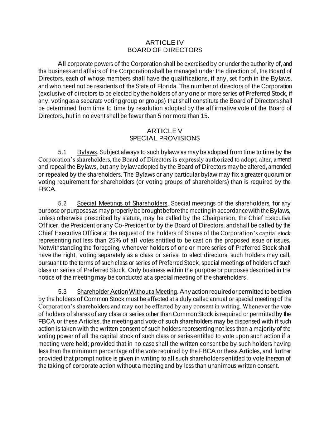 ARTICLE IV BOARD OF DIRECTORS All corporate powers of the Corporation shall be exercised by or under the authority of, and the business and affairs of the Corporation shall be managed under the direction of, the Board of Directors, each of whose members shall have the qualifications, if any, set forth in the Bylaws, and who need not be residents of the State of Florida. The number of directors of the Corporation (exclusive of directors to be elected by the holders of any one or more series of Preferred Stock, if any, voting as a separate voting group or groups) that shall constitute the Board of Directors shall be determined from time to time by resolution adopted by the affirmative vote of the Board of Directors, but in no event shall be fewer than 5 nor more than 15. ARTICLE V SPECIAL PROVISIONS 5.1 Bylaws. Subject always to such bylaws as may be adopted from time to time by the Corporation’s shareholders, the Board of Directors is expressly authorized to adopt, alter, amend and repeal the Bylaws, but any bylaw adopted by the Board of Directors may be altered, amended or repealed by the shareholders. The Bylaws or any particular bylaw may fix a greater quorum or voting requirement for shareholders (or voting groups of shareholders) than is required by the FBCA. 5.2 Special Meetings of Shareholders. Special meetings of the shareholders, for any purpose or purposes as may properly be brought before the meeting in accordance with the Bylaws, unless otherwise prescribed by statute, may be called by the Chairperson, the Chief Executive Officer, the President or any Co-President or by the Board of Directors, and shall be called by the Chief Executive Officer at the request of the holders of Shares of the Corporation’s capital stock representing not less than 25% of all votes entitled to be cast on the proposed issue or issues. Notwithstanding the foregoing, whenever holders of one or more series of Preferred Stock shall have the right, voting separately as a class or series, to elect directors, such holders may call, pursuant to the terms of such class or series of Preferred Stock, special meetings of holders of such class or series of Preferred Stock. Only business within the purpose or purposes described in the notice of the meeting may be conducted at a special meeting of the shareholders. 5.3 Shareholder Action Without a Meeting. Any action required or permitted to be taken by the holders of Common Stock must be effected at a duly called annual or special meeting of the Corporation’s shareholders and may not be effected by any consent in writing. Whenever the vote of holders of shares of any class or series other than Common Stock is required or permitted by the FBCA or these Articles, the meeting and vote of such shareholders may be dispensed with if such action is taken with the written consent of such holders representing not less than a majority of the voting power of all the capital stock of such class or series entitled to vote upon such action if a meeting were held; provided that in no case shall the written consent be by such holders having less than the minimum percentage of the vote required by the FBCA or these Articles, and further provided that prompt notice is given in writing to all such shareholders entitled to vote thereon of the taking of corporate action without a meeting and by less than unanimous written consent.