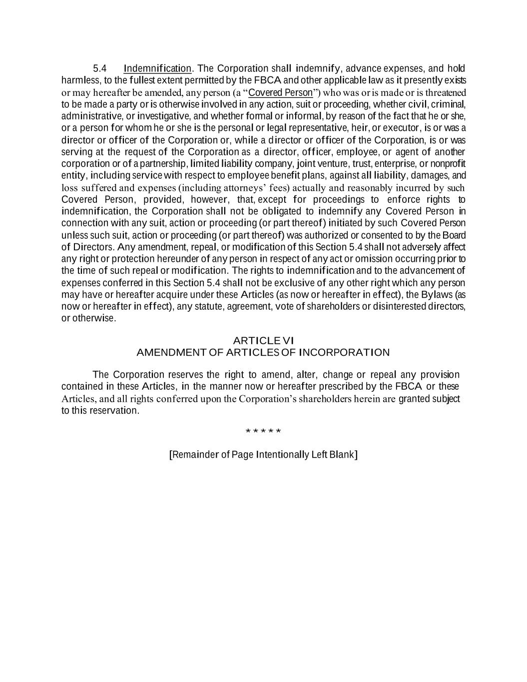 5.4 Indemnification. The Corporation shall indemnify, advance expenses, and hold harmless, to the fullest extent permitted by the FBCA and other applicable law as it presently exists or may hereafter be amended, any person (a “Covered Person”) who was or is made or is threatened to be made a party or is otherwise involved in any action, suit or proceeding, whether civil, criminal, administrative, or investigative, and whether formal or informal, by reason of the fact that he or she, or a person for whom he or she is the personal or legal representative, heir, or executor, is or was a director or officer of the Corporation or, while a director or officer of the Corporation, is or was serving at the request of the Corporation as a director, officer, employee, or agent of another corporation or of a partnership, limited liability company, joint venture, trust, enterprise, or nonprofit entity, including service with respect to employee benefit plans, against all liability, damages, and loss suffered and expenses (including attorneys’ fees) actually and reasonably incurred by such Covered Person, provided, however, that, except for proceedings to enforce rights to indemnification, the Corporation shall not be obligated to indemnify any Covered Person in connection with any suit, action or proceeding (or part thereof) initiated by such Covered Person unless such suit, action or proceeding (or part thereof) was authorized or consented to by the Board of Directors. Any amendment, repeal, or modification of this Section 5.4 shall not adversely affect any right or protection hereunder of any person in respect of any act or omission occurring prior to the time of such repeal or modification. The rights to indemnification and to the advancement of expenses conferred in this Section 5.4 shall not be exclusive of any other right which any person may have or hereafter acquire under these Articles (as now or hereafter in effect), the Bylaws (as now or hereafter in effect), any statute, agreement, vote of shareholders or disinterested directors, or otherwise. ARTICLE VI AMENDMENT OF ARTICLES OF INCORPORATION The Corporation reserves the right to amend, alter, change or repeal any provision contained in these Articles, in the manner now or hereafter prescribed by the FBCA or these Articles, and all rights conferred upon the Corporation’s shareholders herein are granted subject to this reservation. * * * * * [Remainder of Page Intentionally Left Blank]