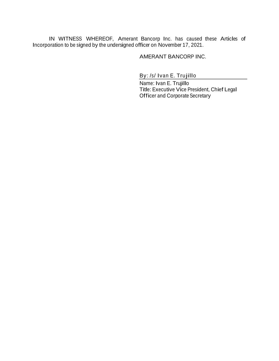 IN WITNESS WHEREOF, Amerant Bancorp Inc. has caused these Articles of Incorporation to be signed by the undersigned officer on November 17, 2021. AMERANT BANCORP INC. By: /s/ Ivan E. Trujillo Name: Ivan E. Trujillo Title: Executive Vice President, Chief Legal Officer and Corporate Secretary