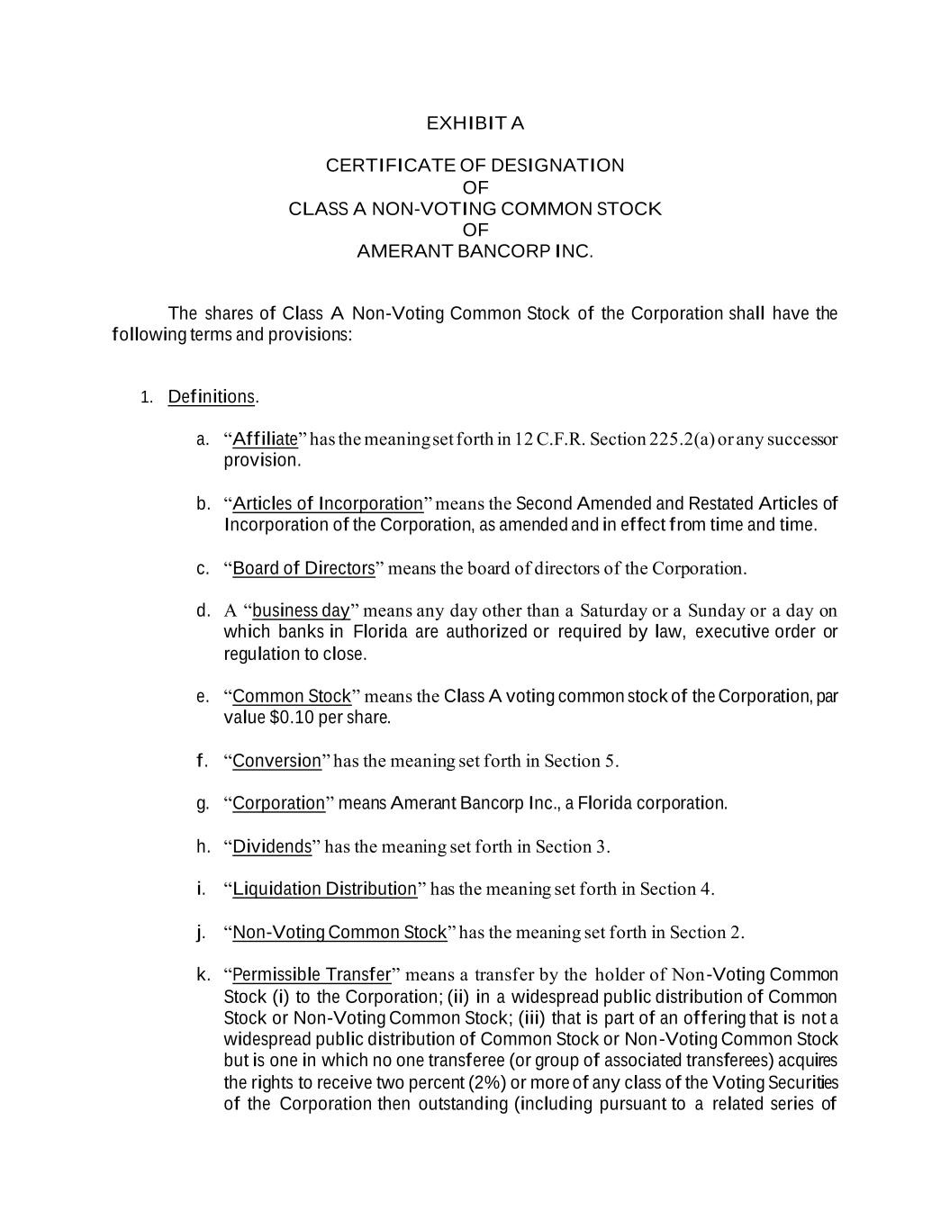 EXHIBIT A CERTIFICATE OF DESIGNATION OF CLASS A NON-VOTING COMMON STOCK OF AMERANT BANCORP INC. The shares of Class A Non-Voting Common Stock of the Corporation shall have the following terms and provisions: 1. Definitions. a. “Affiliate” has the meaning set forth in 12 C.F.R. Section 225.2(a) or any successor provision. b. “Articles of Incorporation” means the Second Amended and Restated Articles of Incorporation of the Corporation, as amended and in effect from time and time. c. “Board of Directors” means the board of directors of the Corporation. d. A “business day” means any day other than a Saturday or a Sunday or a day on which banks in Florida are authorized or required by law, executive order or regulation to close. e. “Common Stock” means the Class A voting common stock of the Corporation, par value $0.10 per share. f. “Conversion” has the meaning set forth in Section 5. g. “Corporation” means Amerant Bancorp Inc., a Florida corporation. h. “Dividends” has the meaning set forth in Section 3. i. “Liquidation Distribution” has the meaning set forth in Section 4. j. “Non-Voting Common Stock” has the meaning set forth in Section 2. k. “Permissible Transfer” means a transfer by the holder of Non-Voting Common Stock (i) to the Corporation; (ii) in a widespread public distribution of Common Stock or Non-Voting Common Stock; (iii) that is part of an offering that is not a widespread public distribution of Common Stock or Non-Voting Common Stock but is one in which no one transferee (or group of associated transferees) acquires the rights to receive two percent (2%) or more of any class of the Voting Securities of the Corporation then outstanding (including pursuant to a related series of