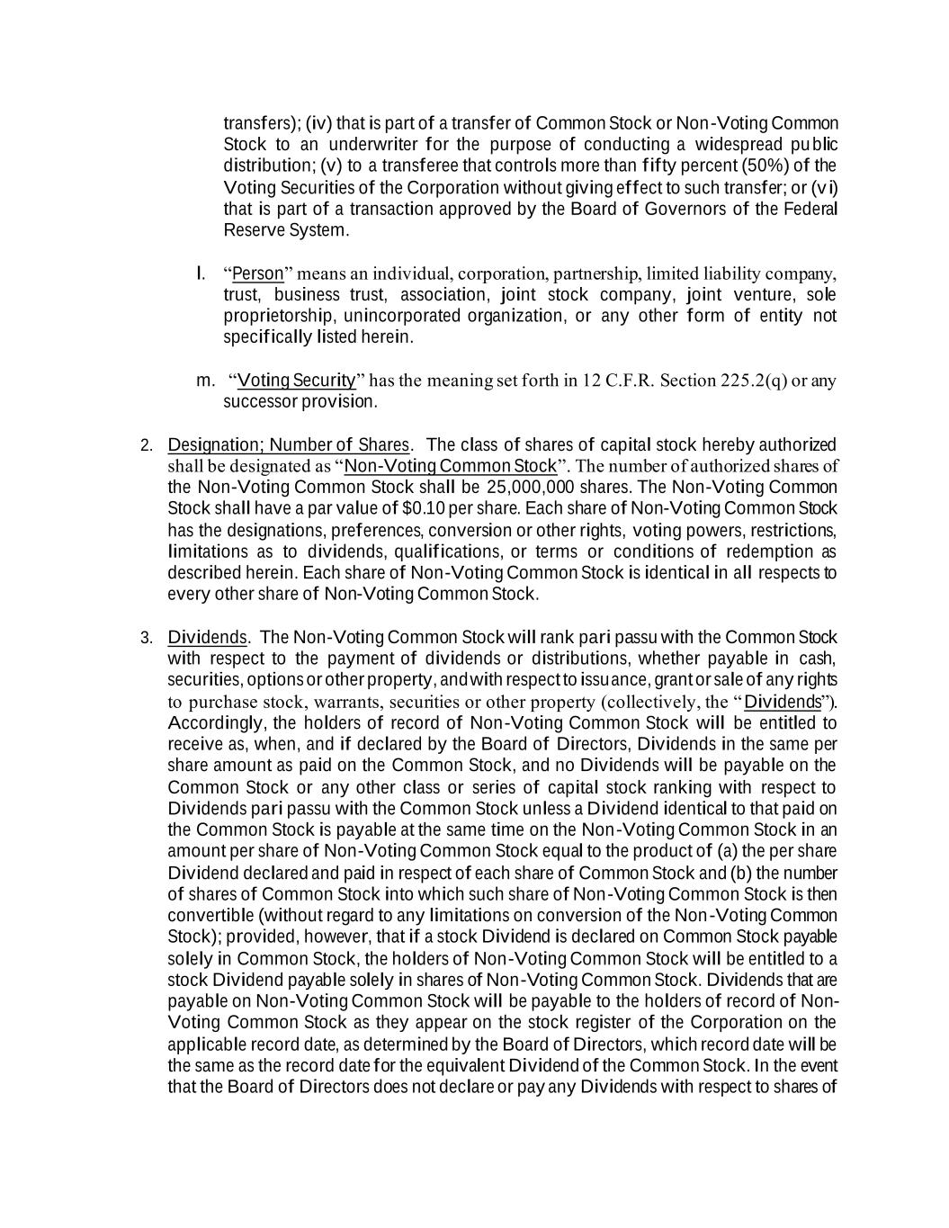 transfers); (iv) that is part of a transfer of Common Stock or Non-Voting Common Stock to an underwriter for the purpose of conducting a widespread pu blic distribution; (v) to a transferee that controls more than fifty percent (50%) of the Voting Securities of the Corporation without giving effect to such transfer; or (v i) that is part of a transaction approved by the Board of Governors of the Federal Reserve System. l. “Person” means an individual, corporation, partnership, limited liability company, trust, business trust, association, joint stock company, joint venture, sole proprietorship, unincorporated organization, or any other form of entity not specifically listed herein. m. “Voting Security” has the meaning set forth in 12 C.F.R. Section 225.2(q) or any successor provision. 2. Designation; Number of Shares. The class of shares of capital stock hereby authorized shall be designated as “Non-Voting Common Stock”. The number of authorized shares of the Non-Voting Common Stock shall be 25,000,000 shares. The Non-Voting Common Stock shall have a par value of $0.10 per share. Each share of Non-Voting Common Stock has the designations, preferences, conversion or other rights, voting powers, restrictions, limitations as to dividends, qualifications, or terms or conditions of redemption as described herein. Each share of Non-Voting Common Stock is identical in all respects to every other share of Non-Voting Common Stock. 3. Dividends. The Non-Voting Common Stock will rank pari passu with the Common Stock with respect to the payment of dividends or distributions, whether payable in cash, securities, options or other property, and with respect to issuance, grant or sale of any rights to purchase stock, warrants, securities or other property (collectively, the “Dividends”). Accordingly, the holders of record of Non-Voting Common Stock will be entitled to receive as, when, and if declared by the Board of Directors, Dividends in the same per share amount as paid on the Common Stock, and no Dividends will be payable on the Common Stock or any other class or series of capital stock ranking with respect to Dividends pari passu with the Common Stock unless a Dividend identical to that paid on the Common Stock is payable at the same time on the Non-Voting Common Stock in an amount per share of Non-Voting Common Stock equal to the product of (a) the per share Dividend declared and paid in respect of each share of Common Stock and (b) the number of shares of Common Stock into which such share of Non-Voting Common Stock is then convertible (without regard to any limitations on conversion of the Non-Voting Common Stock); provided, however, that if a stock Dividend is declared on Common Stock payable solely in Common Stock, the holders of Non-Voting Common Stock will be entitled to a stock Dividend payable solely in shares of Non-Voting Common Stock. Dividends that are payable on Non-Voting Common Stock will be payable to the holders of record of Non- Voting Common Stock as they appear on the stock register of the Corporation on the applicable record date, as determined by the Board of Directors, which record date will be the same as the record date for the equivalent Dividend of the Common Stock. In the event that the Board of Directors does not declare or pay any Dividends with respect to shares of