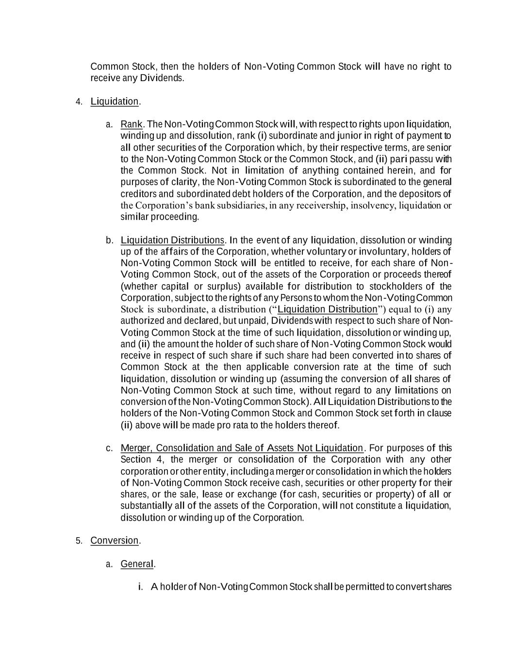 Common Stock, then the holders of Non-Voting Common Stock will have no right to receive any Dividends. 4. Liquidation. a. Rank. The Non-Voting Common Stock will, with respect to rights upon liquidation, winding up and dissolution, rank (i) subordinate and junior in right of payment to all other securities of the Corporation which, by their respective terms, are senior to the Non-Voting Common Stock or the Common Stock, and (ii) pari passu with the Common Stock. Not in limitation of anything contained herein, and for purposes of clarity, the Non-Voting Common Stock is subordinated to the general creditors and subordinated debt holders of the Corporation, and the depositors of the Corporation’s bank subsidiaries, in any receivership, insolvency, liquidation or similar proceeding. b. Liquidation Distributions. In the event of any liquidation, dissolution or winding up of the affairs of the Corporation, whether voluntary or involuntary, holders of Non-Voting Common Stock will be entitled to receive, for each share of Non- Voting Common Stock, out of the assets of the Corporation or proceeds thereof (whether capital or surplus) available for distribution to stockholders of the Corporation, subject to the rights of any Persons to whom the Non-Voting Common Stock is subordinate, a distribution (“Liquidation Distribution”) equal to (i) any authorized and declared, but unpaid, Dividends with respect to such share of Non- Voting Common Stock at the time of such liquidation, dissolution or winding up, and (ii) the amount the holder of such share of Non-Voting Common Stock would receive in respect of such share if such share had been converted in to shares of Common Stock at the then applicable conversion rate at the time of such liquidation, dissolution or winding up (assuming the conversion of all shares of Non-Voting Common Stock at such time, without regard to any limitations on conversion of the Non-Voting Common Stock). All Liquidation Distributions to the holders of the Non-Voting Common Stock and Common Stock set forth in clause (ii) above will be made pro rata to the holders thereof. c. Merger, Consolidation and Sale of Assets Not Liquidation. For purposes of this Section 4, the merger or consolidation of the Corporation with any other corporation or other entity, including a merger or consolidation in which the holders of Non-Voting Common Stock receive cash, securities or other property for their shares, or the sale, lease or exchange (for cash, securities or property) of all or substantially all of the assets of the Corporation, will not constitute a liquidation, dissolution or winding up of the Corporation. 5. Conversion. a. General. i. A holder of Non-Voting Common Stock shall be permitted to convert shares
