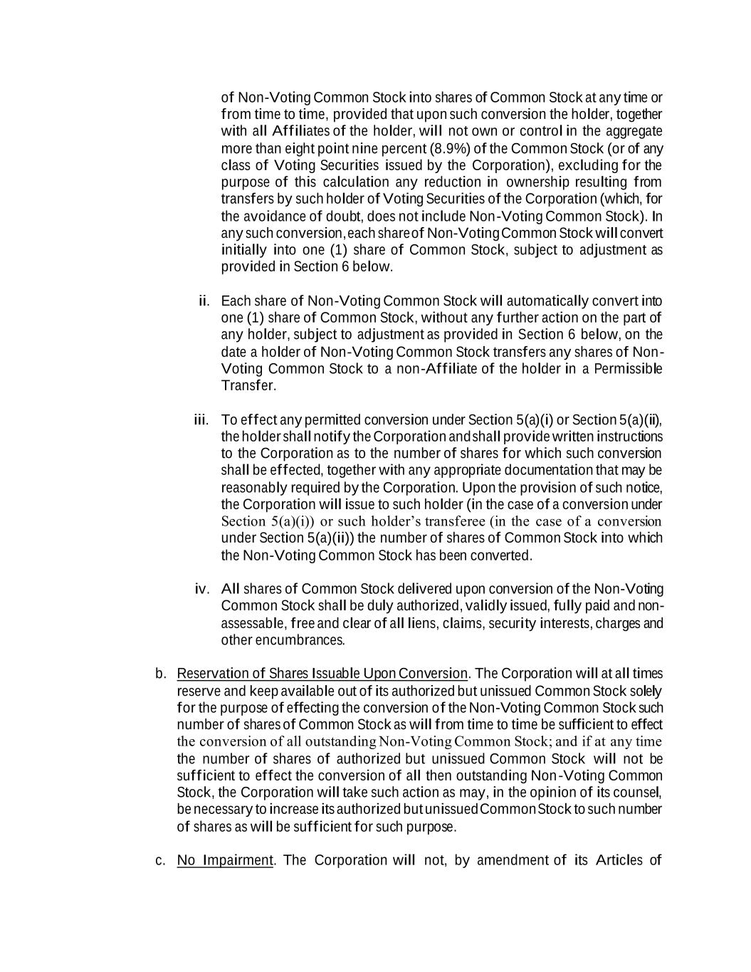 of Non-Voting Common Stock into shares of Common Stock at any time or from time to time, provided that upon such conversion the holder, together with all Affiliates of the holder, will not own or control in the aggregate more than eight point nine percent (8.9%) of the Common Stock (or of any class of Voting Securities issued by the Corporation), excluding for the purpose of this calculation any reduction in ownership resulting from transfers by such holder of Voting Securities of the Corporation (which, for the avoidance of doubt, does not include Non-Voting Common Stock). In any such conversion, each share of Non-Voting Common Stock will convert initially into one (1) share of Common Stock, subject to adjustment as provided in Section 6 below. ii. Each share of Non-Voting Common Stock will automatically convert into one (1) share of Common Stock, without any further action on the part of any holder, subject to adjustment as provided in Section 6 below, on the date a holder of Non-Voting Common Stock transfers any shares of Non- Voting Common Stock to a non-Affiliate of the holder in a Permissible Transfer. iii. To effect any permitted conversion under Section 5(a)(i) or Section 5(a)(ii), the holder shall notify the Corporation and shall provide written instructions to the Corporation as to the number of shares for which such conversion shall be effected, together with any appropriate documentation that may be reasonably required by the Corporation. Upon the provision of such notice, the Corporation will issue to such holder (in the case of a conversion under Section 5(a)(i)) or such holder’s transferee (in the case of a conversion under Section 5(a)(ii)) the number of shares of Common Stock into which the Non-Voting Common Stock has been converted. iv. All shares of Common Stock delivered upon conversion of the Non-Voting Common Stock shall be duly authorized, validly issued, fully paid and non- assessable, free and clear of all liens, claims, security interests, charges and other encumbrances. b. Reservation of Shares Issuable Upon Conversion. The Corporation will at all times reserve and keep available out of its authorized but unissued Common Stock solely for the purpose of effecting the conversion of the Non-Voting Common Stock such number of shares of Common Stock as will from time to time be sufficient to effect the conversion of all outstanding Non‑Voting Common Stock; and if at any time the number of shares of authorized but unissued Common Stock will not be sufficient to effect the conversion of all then outstanding Non-Voting Common Stock, the Corporation will take such action as may, in the opinion of its counsel, be necessary to increase its authorized but unissued Common Stock to such number of shares as will be sufficient for such purpose. c. No Impairment. The Corporation will not, by amendment of its Articles of