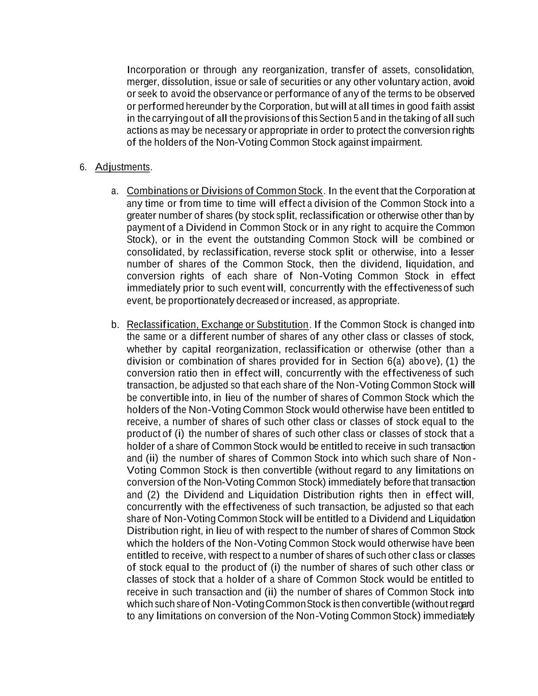 Incorporation or through any reorganization, transfer of assets, consolidation, merger, dissolution, issue or sale of securities or any other voluntary action, avoid or seek to avoid the observance or performance of any of the terms to be observed or performed hereunder by the Corporation, but will at all times in good faith assist in the carrying out of all the provisions of this Section 5 and in the taking of all such actions as may be necessary or appropriate in order to protect the conversion rights of the holders of the Non-Voting Common Stock against impairment. 6. Adjustments. a. Combinations or Divisions of Common Stock. In the event that the Corporation at any time or from time to time will effect a division of the Common Stock into a greater number of shares (by stock split, reclassification or otherwise other than by payment of a Dividend in Common Stock or in any right to acquire the Common Stock), or in the event the outstanding Common Stock will be combined or consolidated, by reclassification, reverse stock split or otherwise, into a lesser number of shares of the Common Stock, then the dividend, liquidation, and conversion rights of each share of Non-Voting Common Stock in effect immediately prior to such event will, concurrently with the effectiveness of such event, be proportionately decreased or increased, as appropriate. b. Reclassification, Exchange or Substitution. If the Common Stock is changed into the same or a different number of shares of any other class or classes of stock, whether by capital reorganization, reclassification or otherwise (other than a division or combination of shares provided for in Section 6(a) above), (1) the conversion ratio then in effect will, concurrently with the effectiveness of such transaction, be adjusted so that each share of the Non-Voting Common Stock will be convertible into, in lieu of the number of shares of Common Stock which the holders of the Non-Voting Common Stock would otherwise have been entitled to receive, a number of shares of such other class or classes of stock equal to the product of (i) the number of shares of such other class or classes of stock that a holder of a share of Common Stock would be entitled to receive in such transaction and (ii) the number of shares of Common Stock into which such share of Non - Voting Common Stock is then convertible (without regard to any limitations on conversion of the Non-Voting Common Stock) immediately before that transaction and (2) the Dividend and Liquidation Distribution rights then in effect will, concurrently with the effectiveness of such transaction, be adjusted so that each share of Non-Voting Common Stock will be entitled to a Dividend and Liquidation Distribution right, in lieu of with respect to the number of shares of Common Stock which the holders of the Non-Voting Common Stock would otherwise have been entitled to receive, with respect to a number of shares of such other class or classes of stock equal to the product of (i) the number of shares of such other class or classes of stock that a holder of a share of Common Stock would be entitled to receive in such transaction and (ii) the number of shares of Common Stock into which such share of Non-Voting Common Stock is then convertible (without regard to any limitations on conversion of the Non-Voting Common Stock) immediately