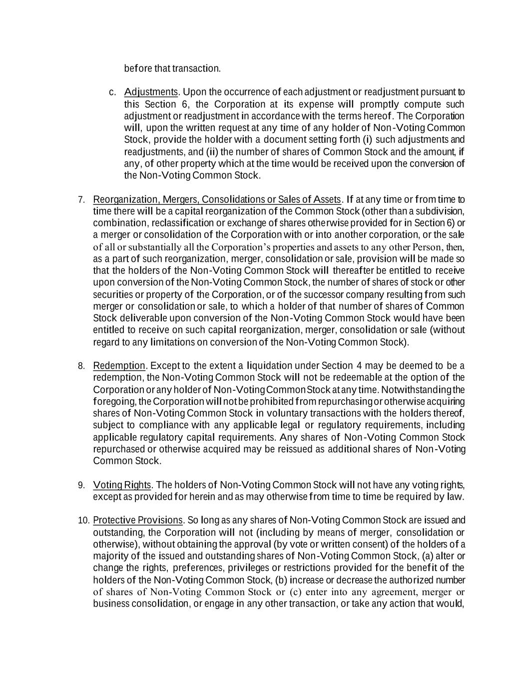 before that transaction. c. Adjustments. Upon the occurrence of each adjustment or readjustment pursuant to this Section 6, the Corporation at its expense will promptly compute such adjustment or readjustment in accordance with the terms hereof. The Corporation will, upon the written request at any time of any holder of Non-Voting Common Stock, provide the holder with a document setting forth (i) such adjustments and readjustments, and (ii) the number of shares of Common Stock and the amount, if any, of other property which at the time would be received upon the conversion of the Non-Voting Common Stock. 7. Reorganization, Mergers, Consolidations or Sales of Assets. If at any time or from time to time there will be a capital reorganization of the Common Stock (other than a subdivision, combination, reclassification or exchange of shares otherwise provided for in Section 6) or a merger or consolidation of the Corporation with or into another corporation, or the sale of all or substantially all the Corporation’s properties and assets to any other Person, then, as a part of such reorganization, merger, consolidation or sale, provision will be made so that the holders of the Non-Voting Common Stock will thereafter be entitled to receive upon conversion of the Non-Voting Common Stock, the number of shares of stock or other securities or property of the Corporation, or of the successor company resulting from such merger or consolidation or sale, to which a holder of that number of shares of Common Stock deliverable upon conversion of the Non-Voting Common Stock would have been entitled to receive on such capital reorganization, merger, consolidation or sale (without regard to any limitations on conversion of the Non-Voting Common Stock). 8. Redemption. Except to the extent a liquidation under Section 4 may be deemed to be a redemption, the Non-Voting Common Stock will not be redeemable at the option of the Corporation or any holder of Non-Voting Common Stock at any time. Notwithstanding the foregoing, the Corporation will not be prohibited from repurchasing or otherwise acquiring shares of Non-Voting Common Stock in voluntary transactions with the holders thereof, subject to compliance with any applicable legal or regulatory requirements, including applicable regulatory capital requirements. Any shares of Non-Voting Common Stock repurchased or otherwise acquired may be reissued as additional shares of Non-Voting Common Stock. 9. Voting Rights. The holders of Non-Voting Common Stock will not have any voting rights, except as provided for herein and as may otherwise from time to time be required by law. 10. Protective Provisions. So long as any shares of Non-Voting Common Stock are issued and outstanding, the Corporation will not (including by means of merger, consolidation or otherwise), without obtaining the approval (by vote or written consent) of the holders of a majority of the issued and outstanding shares of Non-Voting Common Stock, (a) alter or change the rights, preferences, privileges or restrictions provided for the benefit of the holders of the Non-Voting Common Stock, (b) increase or decrease the authorized number of shares of Non‑Voting Common Stock or (c) enter into any agreement, merger or business consolidation, or engage in any other transaction, or take any action that would,
