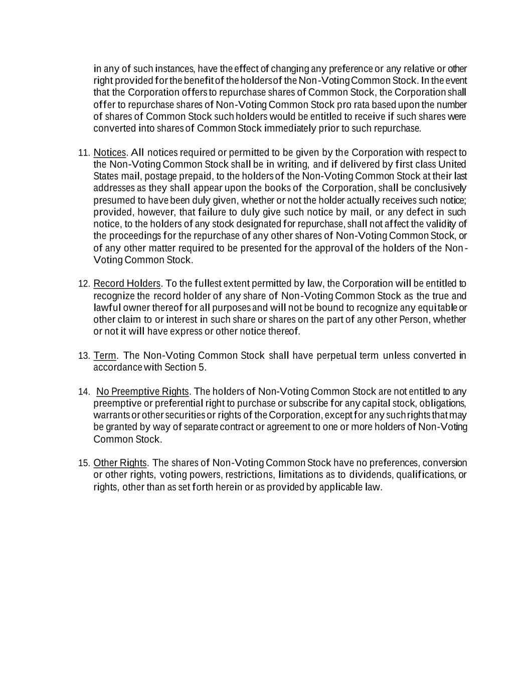 in any of such instances, have the effect of changing any preference or any relative or other right provided for the benefit of the holders of the Non-Voting Common Stock. In the event that the Corporation offers to repurchase shares of Common Stock, the Corporation shall offer to repurchase shares of Non-Voting Common Stock pro rata based upon the number of shares of Common Stock such holders would be entitled to receive if such shares were converted into shares of Common Stock immediately prior to such repurchase. 11. Notices. All notices required or permitted to be given by the Corporation with respect to the Non-Voting Common Stock shall be in writing, and if delivered by first class United States mail, postage prepaid, to the holders of the Non-Voting Common Stock at their last addresses as they shall appear upon the books of the Corporation, shall be conclusively presumed to have been duly given, whether or not the holder actually receives such notice; provided, however, that failure to duly give such notice by mail, or any defect in such notice, to the holders of any stock designated for repurchase, shall not affect the validity of the proceedings for the repurchase of any other shares of Non-Voting Common Stock, or of any other matter required to be presented for the approval of the holders of the Non - Voting Common Stock. 12. Record Holders. To the fullest extent permitted by law, the Corporation will be entitled to recognize the record holder of any share of Non-Voting Common Stock as the true and lawful owner thereof for all purposes and will not be bound to recognize any equitable or other claim to or interest in such share or shares on the part of any other Person, whether or not it will have express or other notice thereof. 13. Term. The Non-Voting Common Stock shall have perpetual term unless converted in accordance with Section 5. 14. No Preemptive Rights. The holders of Non-Voting Common Stock are not entitled to any preemptive or preferential right to purchase or subscribe for any capital stock, obligations, warrants or other securities or rights of the Corporation, except for any such rights that may be granted by way of separate contract or agreement to one or more holders of Non-Voting Common Stock. 15. Other Rights. The shares of Non-Voting Common Stock have no preferences, conversion or other rights, voting powers, restrictions, limitations as to dividends, qualifications, or rights, other than as set forth herein or as provided by applicable law.