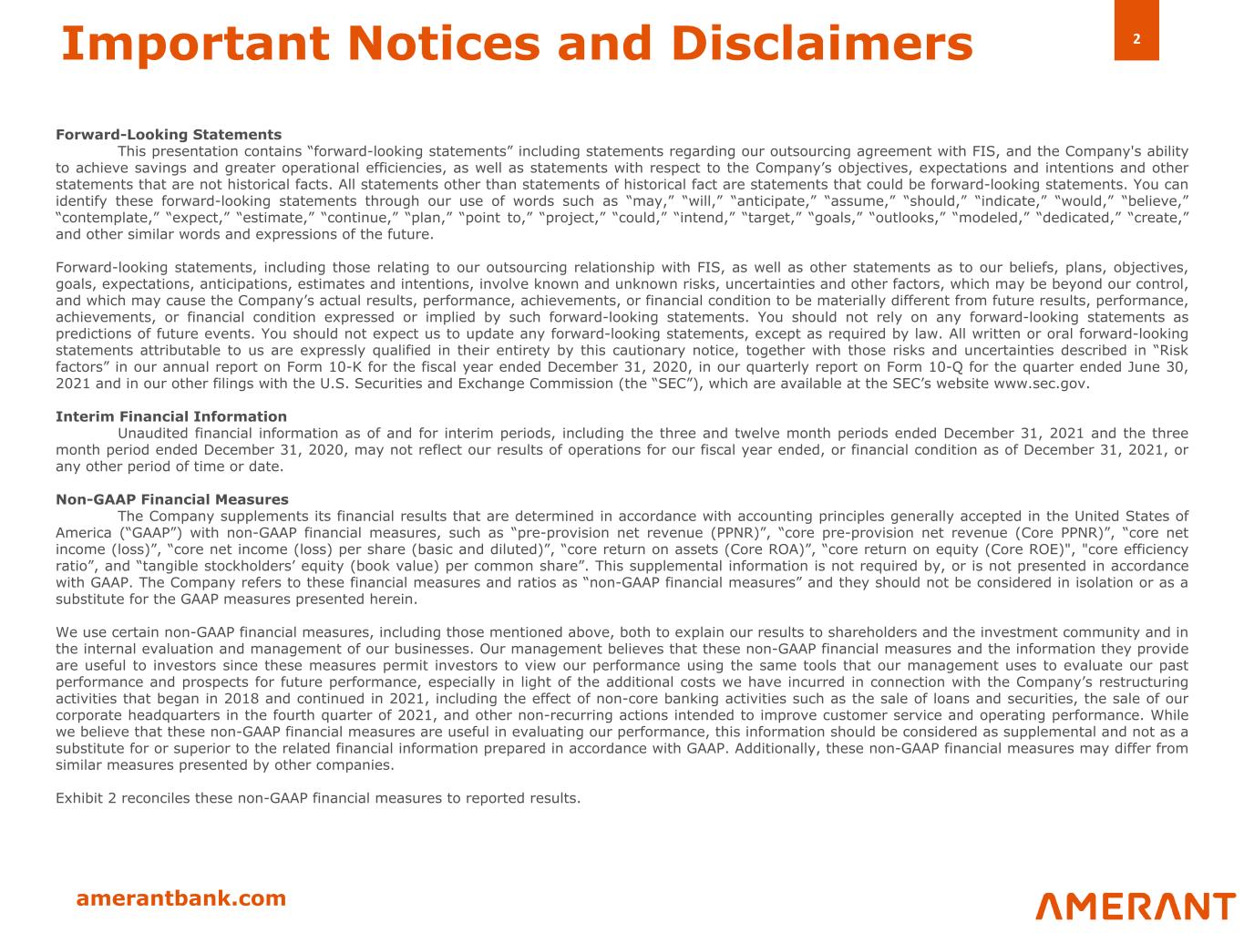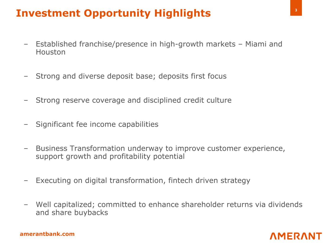 2 amerantbank.com Forward-Looking Statements This presentation contains “forward-looking statements” including statements regarding our outsourcing agreement with FIS, and the Company's ability to achieve savings and greater operational efficiencies, as well as statements with respect to the Company’s objectives, expectations and intentions and other statements that are not historical facts. All statements other than statements of historical fact are statements that could be forward-looking statements. You can identify these forward-looking statements through our use of words such as “may,” “will,” “anticipate,” “assume,” “should,” “indicate,” “would,” “believe,” “contemplate,” “expect,” “estimate,” “continue,” “plan,” “point to,” “project,” “could,” “intend,” “target,” “goals,” “outlooks,” “modeled,” “dedicated,” “create,” and other similar words and expressions of the future. Forward-looking statements, including those relating to our outsourcing relationship with FIS, as well as other statements as to our beliefs, plans, objectives, goals, expectations, anticipations, estimates and intentions, involve known and unknown risks, uncertainties and other factors, which may be beyond our control, and which may cause the Company’s actual results, performance, achievements, or financial condition to be materially different from future results, performance, achievements, or financial condition expressed or implied by such forward-looking statements. You should not rely on any forward-looking statements as predictions of future events. You should not expect us to update any forward-looking statements, except as required by law. All written or oral forward-looking statements attributable to us are expressly qualified in their entirety by this cautionary notice, together with those risks and uncertainties described in “Risk factors” in our annual report on Form 10-K for the fiscal year ended December 31, 2020, in our quarterly report on Form 10-Q for the quarter ended June 30, 2021 and in our other filings with the U.S. Securities and Exchange Commission (the “SEC”), which are available at the SEC’s website www.sec.gov. Interim Financial Information Unaudited financial information as of and for interim periods, including the three and twelve month periods ended December 31, 2021 and the three month period ended December 31, 2020, may not reflect our results of operations for our fiscal year ended, or financial condition as of December 31, 2021, or any other period of time or date. Non-GAAP Financial Measures The Company supplements its financial results that are determined in accordance with accounting principles generally accepted in the United States of America (“GAAP”) with non-GAAP financial measures, such as “pre-provision net revenue (PPNR)”, “core pre-provision net revenue (Core PPNR)”, “core net income (loss)”, “core net income (loss) per share (basic and diluted)”, “core return on assets (Core ROA)”, “core return on equity (Core ROE)", "core efficiency ratio”, and “tangible stockholders’ equity (book value) per common share”. This supplemental information is not required by, or is not presented in accordance with GAAP. The Company refers to these financial measures and ratios as “non-GAAP financial measures” and they should not be considered in isolation or as a substitute for the GAAP measures presented herein. We use certain non-GAAP financial measures, including those mentioned above, both to explain our results to shareholders and the investment community and in the internal evaluation and management of our businesses. Our management believes that these non-GAAP financial measures and the information they provide are useful to investors since these measures permit investors to view our performance using the same tools that our management uses to evaluate our past performance and prospects for future performance, especially in light of the additional costs we have incurred in connection with the Company’s restructuring activities that began in 2018 and continued in 2021, including the effect of non-core banking activities such as the sale of loans and securities, the sale of our corporate headquarters in the fourth quarter of 2021, and other non-recurring actions intended to improve customer service and operating performance. While we believe that these non-GAAP financial measures are useful in evaluating our performance, this information should be considered as supplemental and not as a substitute for or superior to the related financial information prepared in accordance with GAAP. Additionally, these non-GAAP financial measures may differ from similar measures presented by other companies. Exhibit 2 reconciles these non-GAAP financial measures to reported results. Important Notices and Disclaimers