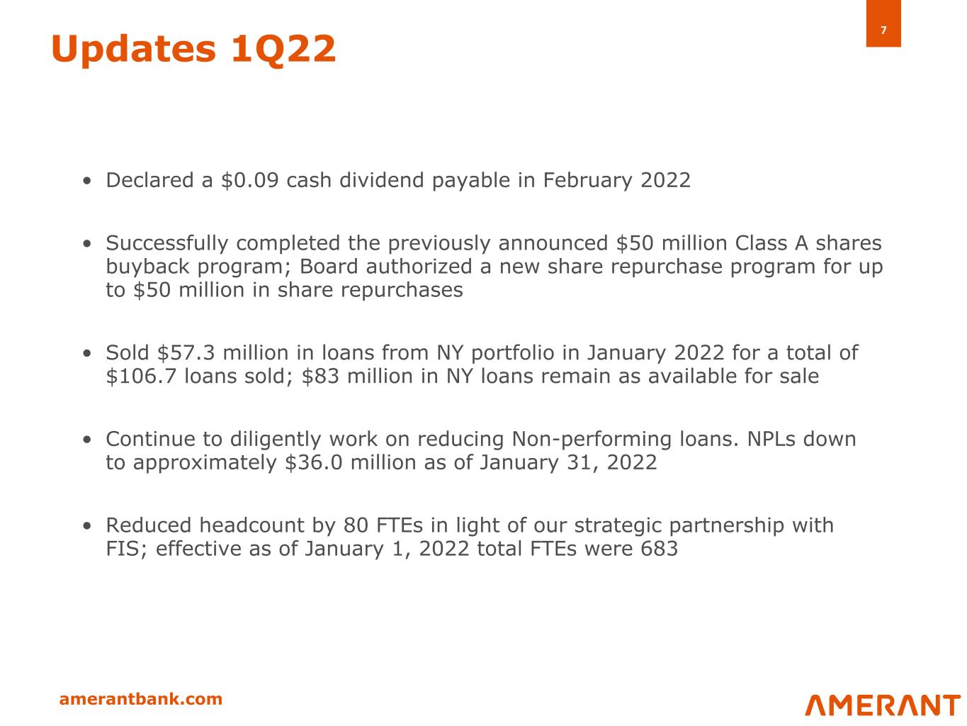 6 amerantbank.com Performance Highlights 4Q21 (1) Non-GAAP Financial Measure. See Slide 9 for a reconciliation to GAAP. • All capital ratios are above "well capitalized" levels • Completed previously announced clean-up merger to simplify capital structure; declared $0.06 cash dividend in December 2021 • $27.9 million and 893,394 Class A shares repurchased as of December 31, 2021 from $50-million share buyback program approved in 3Q21 Capital Business • Core pre-provision net revenue (PPNR)(1) was approximately $19 million compared to $18.3 million in 3Q21 • Net income attributable to the Company of $65.5 million in 4Q21, up 284.4% compared to 3Q21 primarily driven by the sale of headquarters building and a LLR release in 4Q21 • Diluted earnings per share (EPS) was $1.77 in 4Q21, compared to $0.45 in 3Q21; Core diluted EPS(1) was $0.52 for 4Q21 • Total gross loans were $5.6 billion compared to $5.5 billion in 3Q21; average yield increased to 4.10% in 4Q21 from 3.92% in 3Q21 • Sold $49.4 million from NYC loan portfolio • Total deposits remained unchanged at $5.6 billion from 3Q21 • Core deposits were $4.3 billion, up $109.4 million, or 2.62%, compared to 3Q21. This includes interest bearing demand deposits of $1.5 billion as of 4Q21 compared to $1.3 billion as of 3Q21, noninterest bearing deposits of $1.2 billion in 4Q21 and 3Q21, and savings and money market deposits of $1.6 billion in 4Q21 compared to $1.7 billion in 3Q21. • Average cost of total deposits decreased to 0.41% in 4Q21 from 0.44% in 3Q21 • AUM totaled $2.2 billion, up $32.8 million, or 1.5%, from 3Q21 Earnings