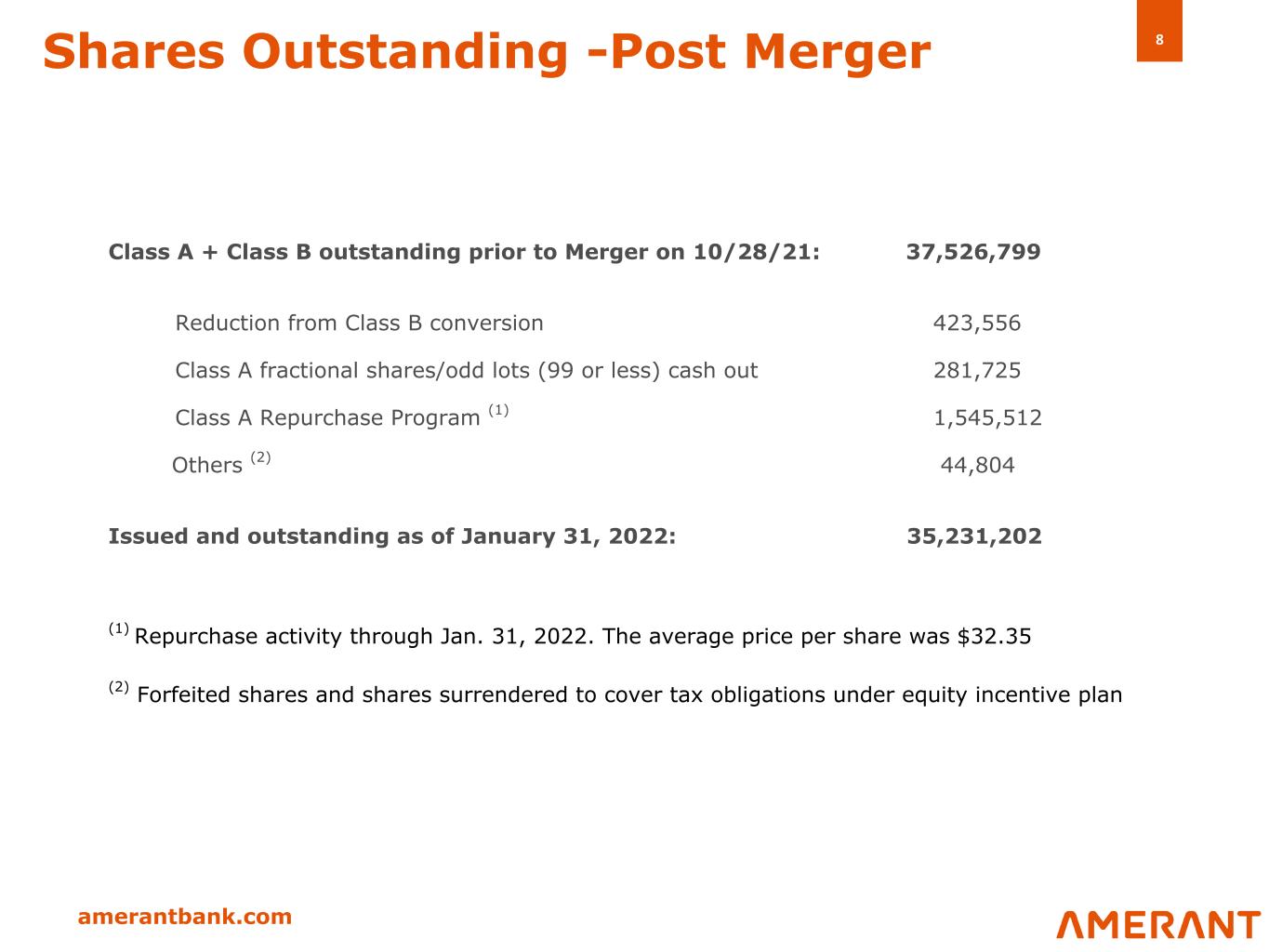 7 amerantbank.com Updates 1Q22 • Declared a $0.09 cash dividend payable in February 2022 • Successfully completed the previously announced $50 million Class A shares buyback program; Board authorized a new share repurchase program for up to $50 million in share repurchases • Sold $57.3 million in loans from NY portfolio in January 2022 for a total of $106.7 loans sold; $83 million in NY loans remain as available for sale • Continue to diligently work on reducing Non-performing loans. NPLs down to approximately $36.0 million as of January 31, 2022 • Reduced headcount by 80 FTEs in light of our strategic partnership with FIS; effective as of January 1, 2022 total FTEs were 683