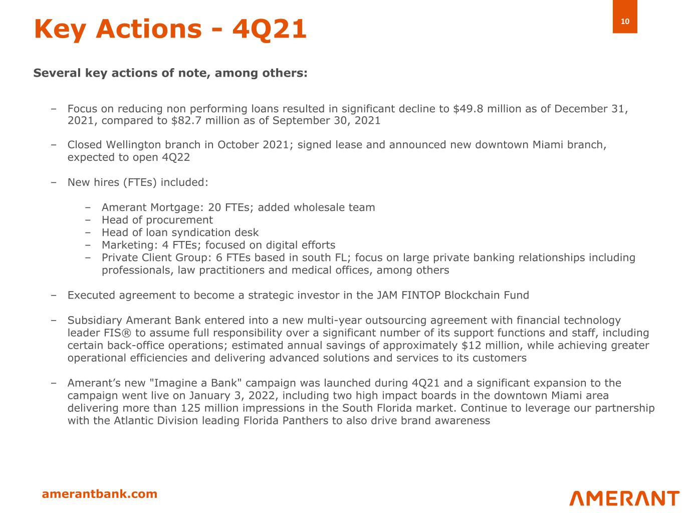 9 amerantbank.com Core PPNR(1) - 4Q21 CORE PPNR(1) increased 3.4% compared to 3Q21 (1) Non-GAAP Financial Measure (( 4Q21 3Q21 Net income attributable to Amerant Bancorp Inc. 65,469 $ 17,031 Plus: reversal of provision for loan losses (6,500) (5,000) Plus: provision for income tax expense 20,172 5,454 Pre-provision net revenue (1) $ 79,141 $ 17,485 Plus: restructuring costs 1,895 758 Less: non-routine noninterest income items $ (62,125) $ 54 Core pre-provision net revenue (1) $ 18,911 $ 18,297