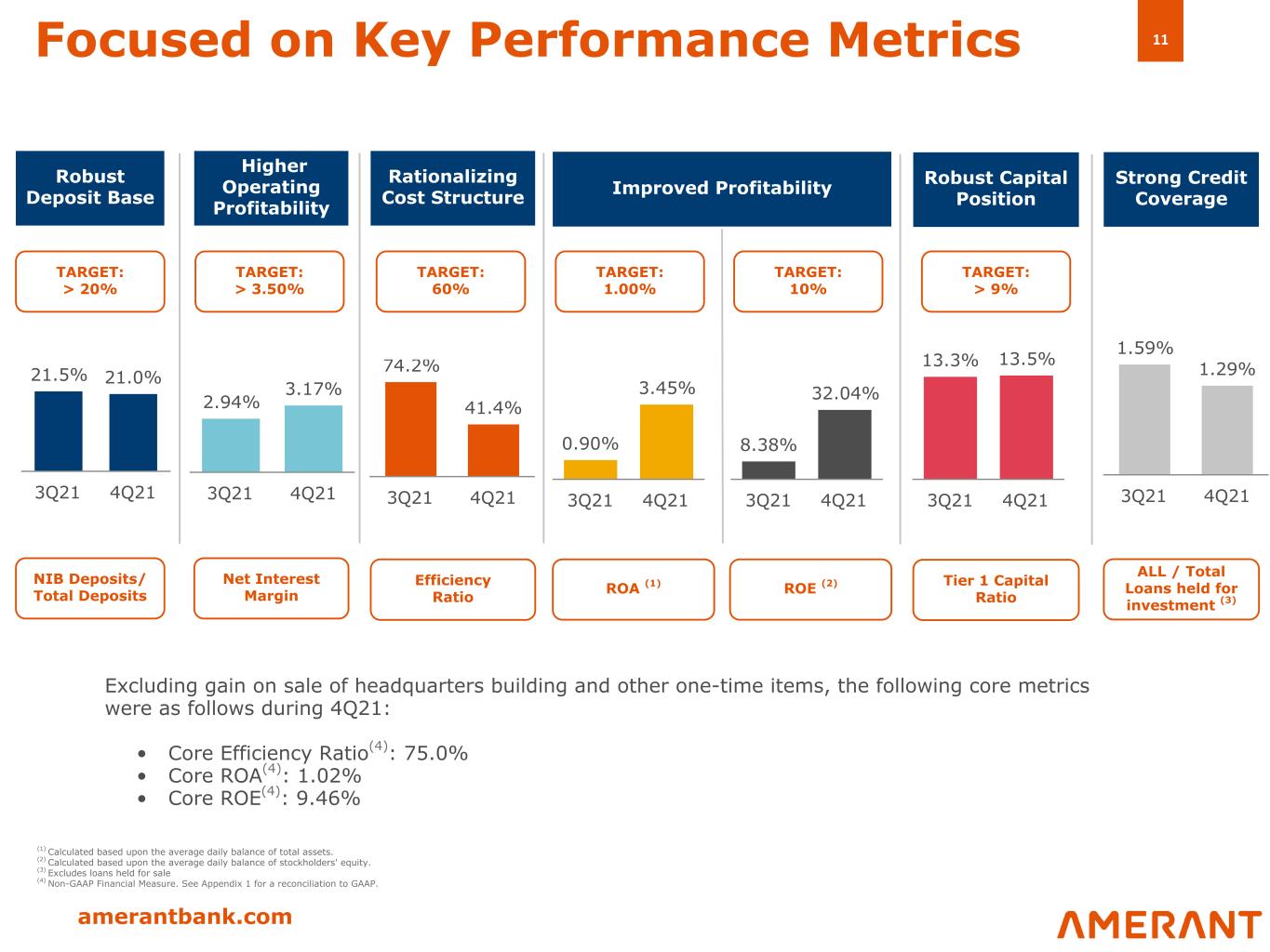 10 amerantbank.com Key Actions - 4Q21 Several key actions of note, among others: – Focus on reducing non performing loans resulted in significant decline to $49.8 million as of December 31, 2021, compared to $82.7 million as of September 30, 2021 – Closed Wellington branch in October 2021; signed lease and announced new downtown Miami branch, expected to open 4Q22 – New hires (FTEs) included: – Amerant Mortgage: 20 FTEs; added wholesale team – Head of procurement – Head of loan syndication desk – Marketing: 4 FTEs; focused on digital efforts – Private Client Group: 6 FTEs based in south FL; focus on large private banking relationships including professionals, law practitioners and medical offices, among others – Executed agreement to become a strategic investor in the JAM FINTOP Blockchain Fund – Subsidiary Amerant Bank entered into a new multi-year outsourcing agreement with financial technology leader FIS® to assume full responsibility over a significant number of its support functions and staff, including certain back-office operations; estimated annual savings of approximately $12 million, while achieving greater operational efficiencies and delivering advanced solutions and services to its customers – Amerant’s new "Imagine a Bank" campaign was launched during 4Q21 and a significant expansion to the campaign went live on January 3, 2022, including two high impact boards in the downtown Miami area delivering more than 125 million impressions in the South Florida market. Continue to leverage our partnership with the Atlantic Division leading Florida Panthers to also drive brand awareness