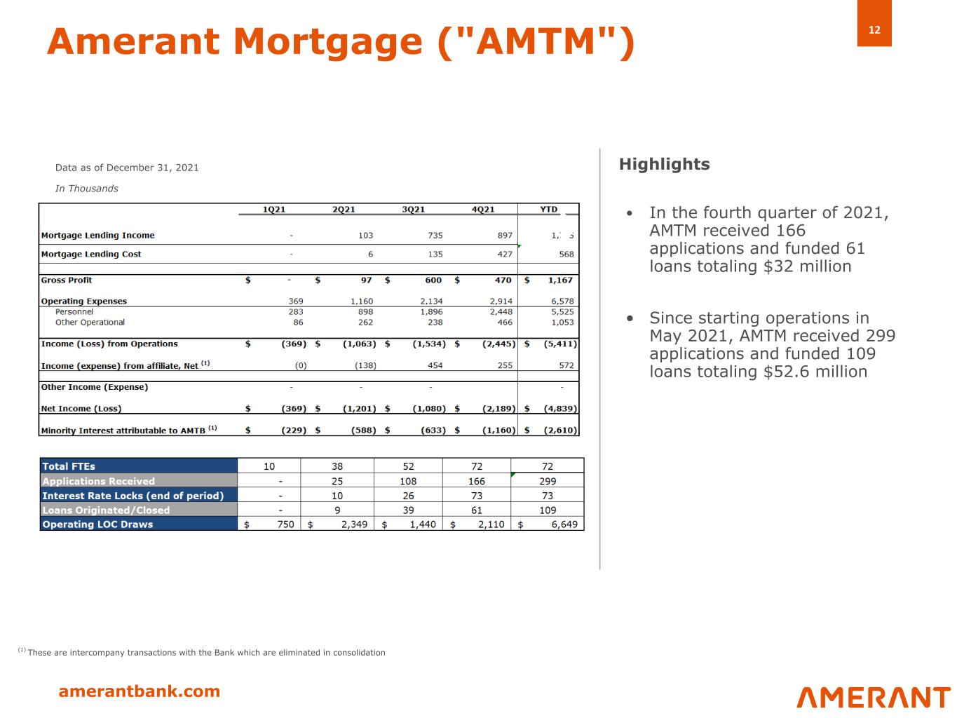 11 amerantbank.com 74.2% 41.4% 3Q21 4Q21 21.5% 21.0% 3Q21 4Q21 13.3% 13.5% 3Q21 4Q21 2.94% 3.17% 3Q21 4Q21 Focused on Key Performance Metrics Robust Deposit Base Robust Capital Position Higher Operating Profitability Rationalizing Cost Structure (1) Calculated based upon the average daily balance of total assets. (2) Calculated based upon the average daily balance of stockholders' equity. (3) Excludes loans held for sale (4) Non-GAAP Financial Measure. See Appendix 1 for a reconciliation to GAAP. 1.59% 1.29% 3Q21 4Q21 Strong Credit Coverage 0.90% 3.45% 3Q21 4Q21 Improved Profitability 8.38% 32.04% 3Q21 4Q21 NIB Deposits/ Total Deposits Tier 1 Capital Ratio Net Interest Margin Efficiency Ratio ALL / Total Loans held for investment (3) ROA (1) ROE (2) Excluding gain on sale of headquarters building and other one-time items, the following core metrics were as follows during 4Q21: • Core Efficiency Ratio(4): 75.0% • Core ROA(4): 1.02% • Core ROE(4): 9.46% TARGET: > 20% TARGET: > 3.50% TARGET: 60% TARGET: 1.00% TARGET: 10% TARGET: > 9%