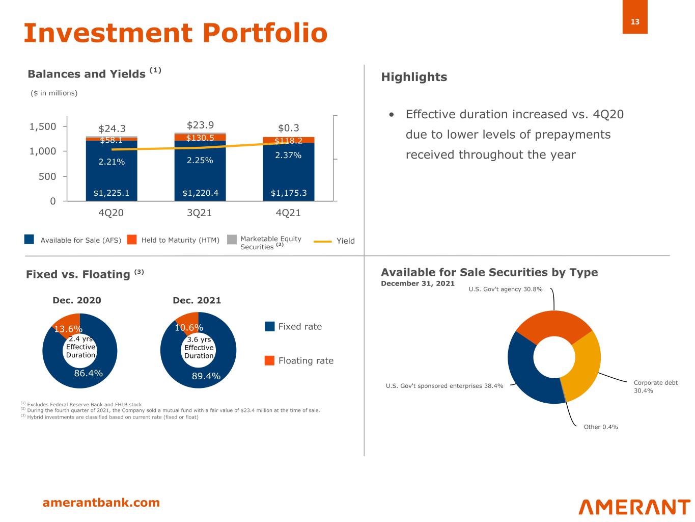 20 amerantbank.com $211 $214 $217 $221 $223 -50 bps -25 bps BASE +25 bps +50 bps 160 180 200 (December 31, 2021) Fixed 50% Adjustable 50% Interest Rate Sensitivity By Interest TypeBy Rate Type By Repricing Term (1) NII and percentage change represents the base scenario of net interest income. The base scenario assumes (i) flat interest rates over the next 12 months, (ii) that total financial instrument balances are kept constant over time and (iii) that interest rate shocks are instant and parallel to the yield curve Loan Portfolio & Repricing Detail Impact on NII from Interest Rate Change (1) Net Interest Income Change from base <1 year 54% 1-3 years 8% 4-5 years 9% 5+ years 29% -2.8% -1.4% 0.0% 2.6%1.6% ($ in M ill io ns ) (As of December 31, 2021) Swap 3% Fixed 50% UST 2% Libor 35% Prime 10%