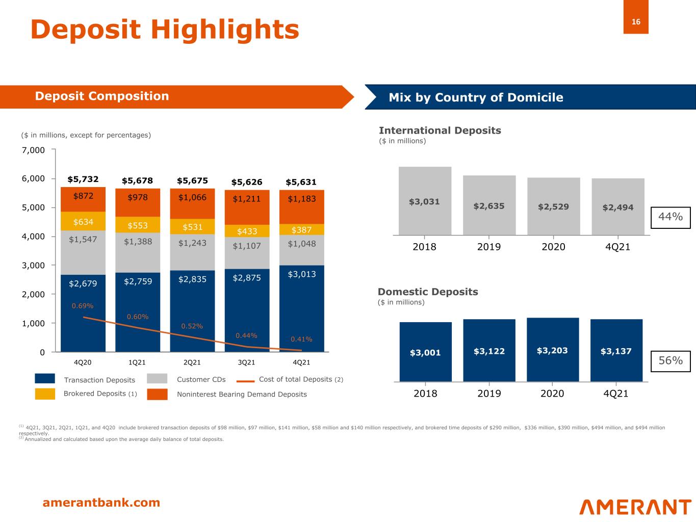15 amerantbank.com $110.9 $110.9 $104.2 $83.4 $69.91.90% 1.93% 1.86% 1.59% 1.29% 4Q20 1Q21 2Q21 3Q21 4Q21 0.40% —% 0.12% 1.16% 0.52% 4Q20 1Q21 2Q21 3Q21 4Q21 • Credit quality remains sound and reserve coverage is strong; released $6.5 million from the ALL in 4Q21 • NPLs to total loans declined to 0.89%, or $49.8 million compared to 1.51%, or $82.7 million in 3Q21 • NPLs 100% of Non-Performing Loans over $1 million and secured with RE collateral have independent third-party collateral valuations performed during 2021 supporting current ALL levels • NCOs totaled $7.0 million in 4Q21; $3.2 million were reserved for in previous quarters with no impact to earnings • Collected $4.8 million in connection with the Coffee trader relationship; contributed to a release of $2.3 million in specific reserves Net Charge-Offs / Average Total Loans (2)(3) Credit Quality Allowance for Loan Losses ($ in millions) Non-Performing Assets (1) / Total Assets Allowance for Loan Losses / Total NPL Allowance for Loan Losses ALL as a % of Total Loans held for investment (3) (1) Non-performing assets include all accruing loans past due 90 days or more, all nonaccrual loans, restructured loans that are considered TDRs, and OREO properties acquired through or in lieu of foreclosure. (2) Annualized and calculated based upon the average daily balance of outstanding loan principal balance net of unamortized deferred loan fees and costs, excluding the allowance for loan losses. During the third quarter of 2021 and 2020, the Company charged off $5.7 million and $19.3 million, respectively against the allowance for loan losses as a result of the deterioration of one commercial loan relationship. (3) Total Loans exclude loans held for sale. 1.13% 1.16% 1.61% 1.24% 0.78% 4Q20 1Q21 2Q21 3Q21 4Q21 1.3x 1.2x 0.9x 1.0x 1.4x 4Q20 1Q21 2Q21 3Q21 4Q21