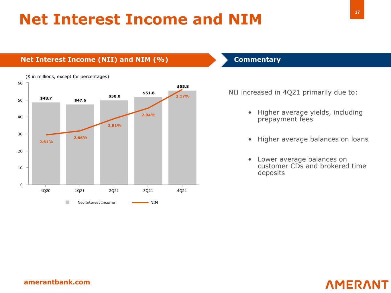 16 amerantbank.com $5,732 $5,678 $5,675 $5,626 $5,631 $2,679 $2,759 $2,835 $2,875 $3,013 $1,547 $1,388 $1,243 $1,107 $1,048 $634 $553 $531 $433 $387 $872 $978 $1,066 $1,211 $1,183 0.69% 0.60% 0.52% 0.44% 0.41% 4Q20 1Q21 2Q21 3Q21 4Q21 0 1,000 2,000 3,000 4,000 5,000 6,000 7,000 $3,031 $2,635 $2,529 $2,494 2018 2019 2020 4Q21 $3,001 $3,122 $3,203 $3,137 2018 2019 2020 4Q21 Domestic Deposits ($ in millions) Deposit Highlights Deposit Composition 56% International Deposits ($ in millions) Mix by Country of Domicile Transaction Deposits Customer CDs Brokered Deposits (1) Cost of total Deposits (2) ($ in millions, except for percentages) 44% (1) 4Q21, 3Q21, 2Q21, 1Q21, and 4Q20 include brokered transaction deposits of $98 million, $97 million, $141 million, $58 million and $140 million respectively, and brokered time deposits of $290 million, $336 million, $390 million, $494 million, and $494 million respectively. (2) Annualized and calculated based upon the average daily balance of total deposits. Noninterest Bearing Demand Deposits