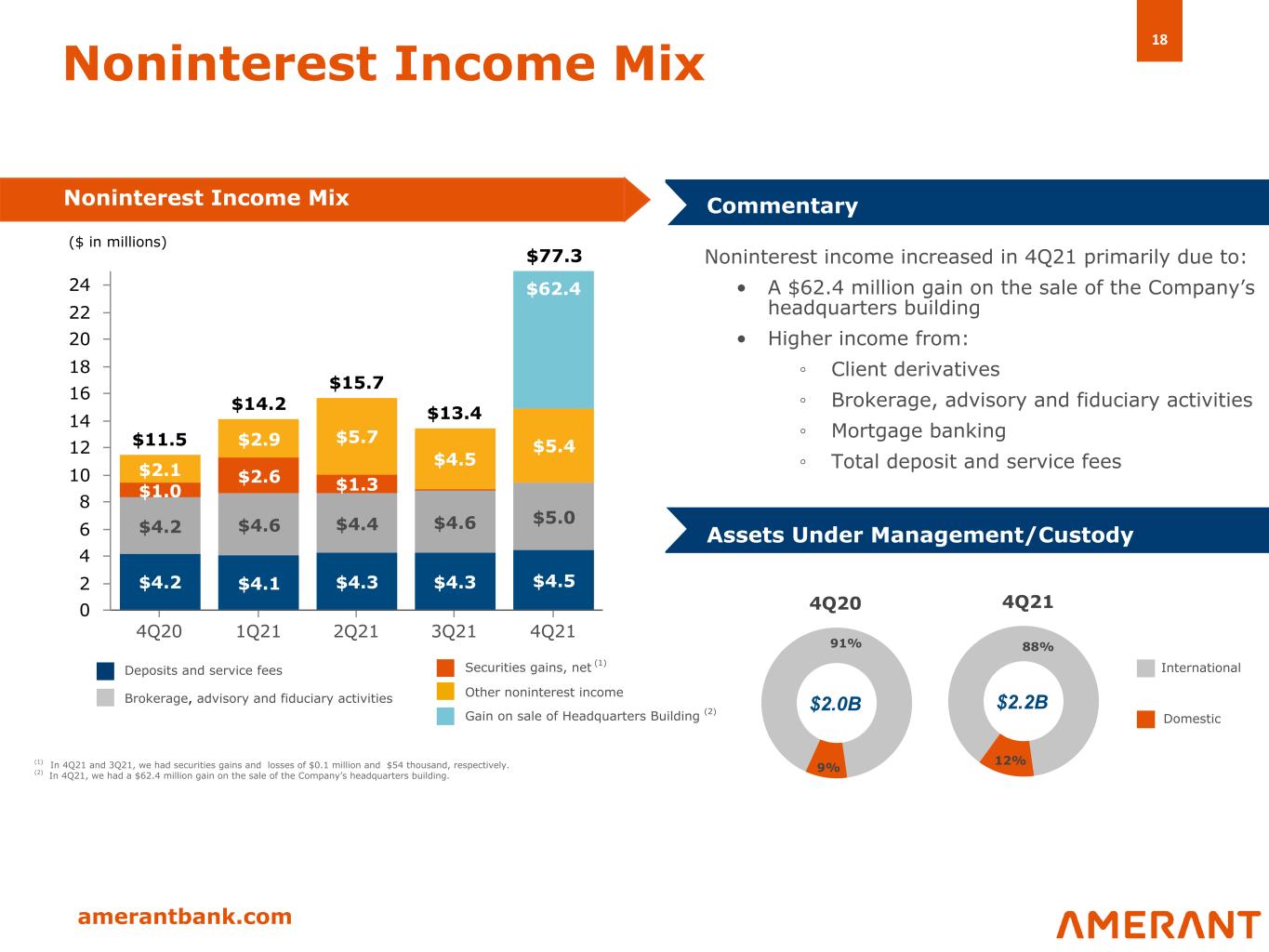 17 amerantbank.com $48.7 $47.6 $50.0 $51.8 $55.8 2.61% 2.66% 2.81% 2.94% 3.17% Net Interest Income NIM 4Q20 1Q21 2Q21 3Q21 4Q21 0 10 20 30 40 50 60 NII increased in 4Q21 primarily due to: • Higher average yields, including prepayment fees • Higher average balances on loans • Lower average balances on customer CDs and brokered time deposits Net Interest Income and NIM Net Interest Income (NII) and NIM (%) Commentary ($ in millions, except for percentages)