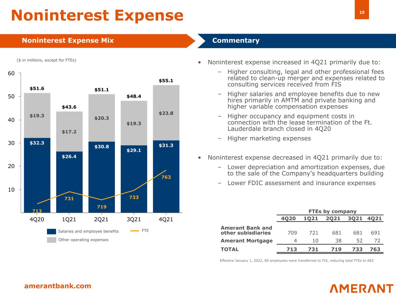 18 amerantbank.com $11.5 $14.2 $15.7 $13.4 $4.2 $4.1 $4.3 $4.3 $4.5 $4.2 $4.6 $4.4 $4.6 $5.0 $1.0 $2.6 $1.3 $2.1 $2.9 $5.7 $4.5 $5.4 $62.4 4Q20 1Q21 2Q21 3Q21 4Q21 0 2 4 6 8 10 12 14 16 18 20 22 24 9% 91% 12% 88% Noninterest Income Mix Noninterest Income Mix Commentary Noninterest income increased in 4Q21 primarily due to: • A $62.4 million gain on the sale of the Company’s headquarters building • Higher income from: ◦ Client derivatives ◦ Brokerage, advisory and fiduciary activities ◦ Mortgage banking ◦ Total deposit and service fees Assets Under Management/Custody Deposits and service fees Brokerage, advisory and fiduciary activities Other noninterest income $2.2B Domestic International 4Q214Q20 $2.0B ($ in millions) Securities gains, net (1) (1) In 4Q21 and 3Q21, we had securities gains and losses of $0.1 million and $54 thousand, respectively. (2) In 4Q21, we had a $62.4 million gain on the sale of the Company’s headquarters building. $77.3 Gain on sale of Headquarters Building (2)
