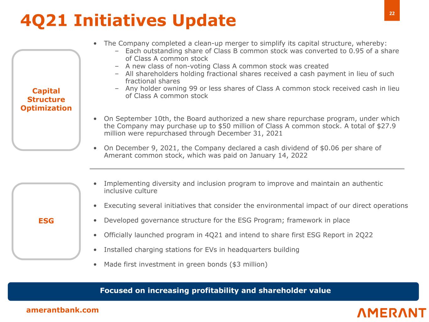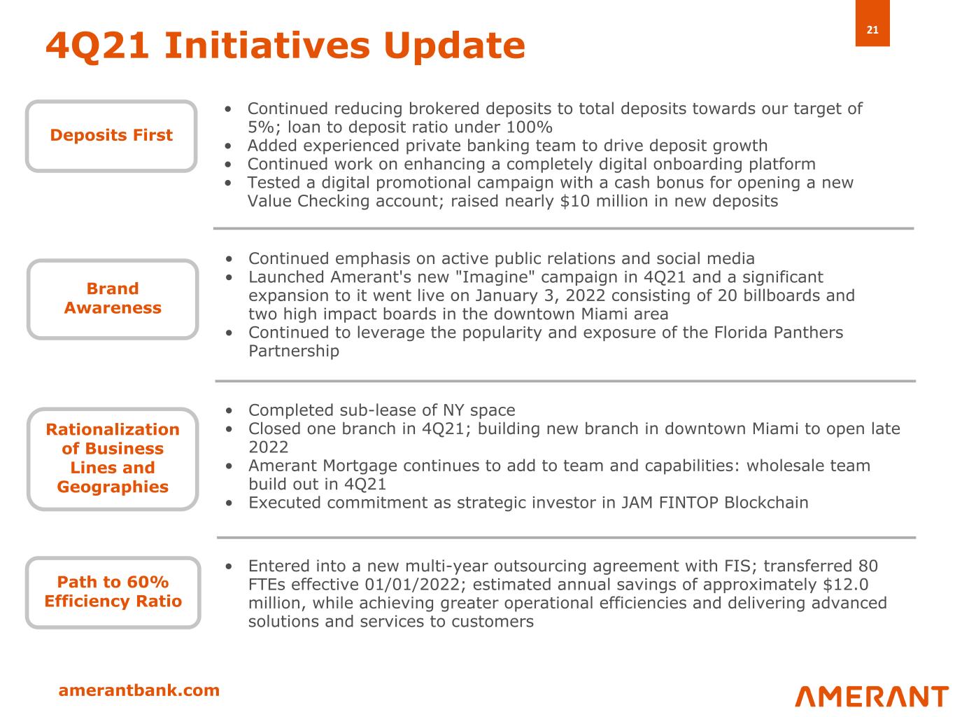 21 amerantbank.com 4Q21 Initiatives Update • Continued reducing brokered deposits to total deposits towards our target of 5%; loan to deposit ratio under 100% • Added experienced private banking team to drive deposit growth • Continued work on enhancing a completely digital onboarding platform • Tested a digital promotional campaign with a cash bonus for opening a new Value Checking account; raised nearly $10 million in new deposits Deposits First • Continued emphasis on active public relations and social media • Launched Amerant's new "Imagine" campaign in 4Q21 and a significant expansion to it went live on January 3, 2022 consisting of 20 billboards and two high impact boards in the downtown Miami area • Continued to leverage the popularity and exposure of the Florida Panthers Partnership Brand Awareness • Completed sub-lease of NY space • Closed one branch in 4Q21; building new branch in downtown Miami to open late 2022 • Amerant Mortgage continues to add to team and capabilities: wholesale team build out in 4Q21 • Executed commitment as strategic investor in JAM FINTOP Blockchain Rationalization of Business Lines and Geographies • Entered into a new multi-year outsourcing agreement with FIS; transferred 80 FTEs effective 01/01/2022; estimated annual savings of approximately $12.0 million, while achieving greater operational efficiencies and delivering advanced solutions and services to customers Path to 60% Efficiency Ratio