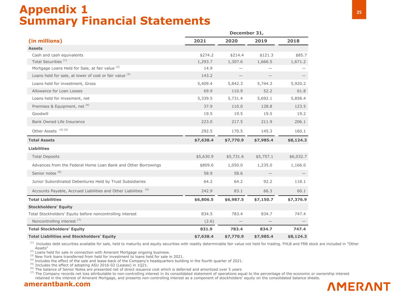 30 amerantbank.com Appendix 2 Non-GAAP Financial Measures Reconciliations (cont’d)* 2021 2020 2019 2018 Net income (loss) / Average total assets (ROA) 1.50 % (0.02) % 0.65 % 0.55 % Plus: after tax impact of restructuring costs 0.07 % 0.06 % 0.05 % 0.06 % Plus: after tax impact of total spin-off costs — % — % — % 0.08 % Less: after tax impact of non-routine noninterest income items -0.68 % (0.13) % -0.05 % — % Core net income (loss) / Average total assets (Core ROA) 0.89 % (0.09) % 0.65 % 0.69 % Net income (loss) / Average stockholders' equity (ROE) 14.19 % (0.21) % 6.43 % 6.29 % Plus: after tax impact of restructuring costs 0.68 % 0.57 % 0.51 % 0.70 % Plus: after tax impact of total spin-off costs — % — % — % 0.96 % Less: after tax impact of non-routine noninterest income items -6.48 % (1.19) % -0.45 % 0.02 % Core net income (loss) / stockholders' equity (Core ROE) 8.39 % (0.83) % 6.49 % 7.97 % Efficiency ratio 60.85 % 67.95 % 77.47 % 78.77 % Less: impact of restructuring costs -2.16 % -4.51 % -1.89 % -2.34 % Less: impact of total spin-off costs 0.00 % 0.00 % 0.00 % -2.44 % Plus: after tax impact of non-routine items in noninterest income 15.27 % 6.70 % 1.30 % -0.04 % Core efficiency ratio 73.96 % 70.14 % 76.88 % 73.95 % (*) See footnotes in Slide 31