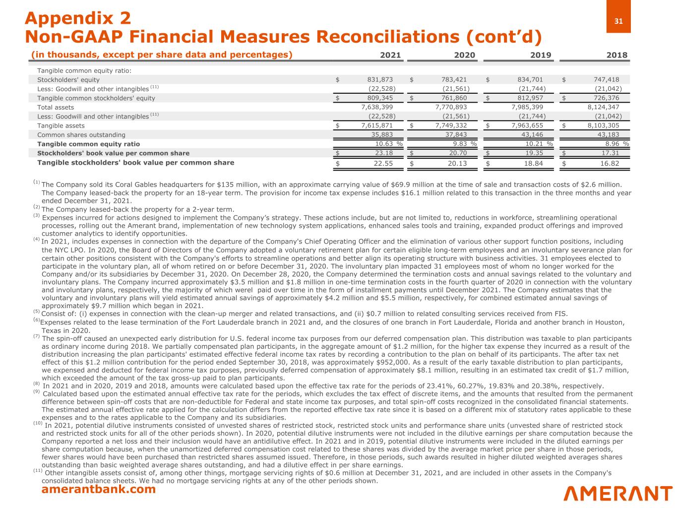 31 amerantbank.com Appendix 2 Non-GAAP Financial Measures Reconciliations (cont’d) (in thousands, except per share data and percentages) 2021 2020 2019 2018 Tangible common equity ratio: Stockholders' equity $ 831,873 $ 783,421 $ 834,701 $ 747,418 Less: Goodwill and other intangibles (11) (22,528) (21,561) (21,744) (21,042) Tangible common stockholders' equity $ 809,345 $ 761,860 $ 812,957 $ 726,376 Total assets 7,638,399 7,770,893 7,985,399 8,124,347 Less: Goodwill and other intangibles (11) (22,528) (21,561) (21,744) (21,042) Tangible assets $ 7,615,871 $ 7,749,332 $ 7,963,655 $ 8,103,305 Common shares outstanding 35,883 37,843 43,146 43,183 Tangible common equity ratio 10.63 % 9.83 % 10.21 % 8.96 % Stockholders' book value per common share $ 23.18 $ 20.70 $ 19.35 $ 17.31 Tangible stockholders' book value per common share $ 22.55 $ 20.13 $ 18.84 $ 16.82 (1) The Company sold its Coral Gables headquarters for $135 million, with an approximate carrying value of $69.9 million at the time of sale and transaction costs of $2.6 million. The Company leased-back the property for an 18-year term. The provision for income tax expense includes $16.1 million related to this transaction in the three months and year ended December 31, 2021. (2) The Company leased-back the property for a 2-year term. (3) Expenses incurred for actions designed to implement the Company’s strategy. These actions include, but are not limited to, reductions in workforce, streamlining operational processes, rolling out the Amerant brand, implementation of new technology system applications, enhanced sales tools and training, expanded product offerings and improved customer analytics to identify opportunities. (4) In 2021, includes expenses in connection with the departure of the Company's Chief Operating Officer and the elimination of various other support function positions, including the NYC LPO. In 2020, the Board of Directors of the Company adopted a voluntary retirement plan for certain eligible long-term employees and an involuntary severance plan for certain other positions consistent with the Company's efforts to streamline operations and better align its operating structure with business activities. 31 employees elected to participate in the voluntary plan, all of whom retired on or before December 31, 2020. The involuntary plan impacted 31 employees most of whom no longer worked for the Company and/or its subsidiaries by December 31, 2020. On December 28, 2020, the Company determined the termination costs and annual savings related to the voluntary and involuntary plans. The Company incurred approximately $3.5 million and $1.8 million in one-time termination costs in the fourth quarter of 2020 in connection with the voluntary and involuntary plans, respectively, the majority of which werel paid over time in the form of installment payments until December 2021. The Company estimates that the voluntary and involuntary plans will yield estimated annual savings of approximately $4.2 million and $5.5 million, respectively, for combined estimated annual savings of approximately $9.7 million which began in 2021. (5) Consist of: (i) expenses in connection with the clean-up merger and related transactions, and (ii) $0.7 million to related consulting services received from FIS. (6)Expenses related to the lease termination of the Fort Lauderdale branch in 2021 and, and the closures of one branch in Fort Lauderdale, Florida and another branch in Houston, Texas in 2020. (7) The spin-off caused an unexpected early distribution for U.S. federal income tax purposes from our deferred compensation plan. This distribution was taxable to plan participants as ordinary income during 2018. We partially compensated plan participants, in the aggregate amount of $1.2 million, for the higher tax expense they incurred as a result of the distribution increasing the plan participants' estimated effective federal income tax rates by recording a contribution to the plan on behalf of its participants. The after tax net effect of this $1.2 million contribution for the period ended September 30, 2018, was approximately $952,000. As a result of the early taxable distribution to plan participants, we expensed and deducted for federal income tax purposes, previously deferred compensation of approximately $8.1 million, resulting in an estimated tax credit of $1.7 million, which exceeded the amount of the tax gross-up paid to plan participants. (8) In 2021 and in 2020, 2019 and 2018, amounts were calculated based upon the effective tax rate for the periods of 23.41%, 60.27%, 19.83% and 20.38%, respectively. (9) Calculated based upon the estimated annual effective tax rate for the periods, which excludes the tax effect of discrete items, and the amounts that resulted from the permanent difference between spin-off costs that are non-deductible for Federal and state income tax purposes, and total spin-off costs recognized in the consolidated financial statements. The estimated annual effective rate applied for the calculation differs from the reported effective tax rate since it is based on a different mix of statutory rates applicable to these expenses and to the rates applicable to the Company and its subsidiaries. (10) In 2021, potential dilutive instruments consisted of unvested shares of restricted stock, restricted stock units and performance share units (unvested share of restricted stock and restricted stock units for all of the other periods shown). In 2020, potential dilutive instruments were not included in the dilutive earnings per share computation because the Company reported a net loss and their inclusion would have an antidilutive effect. In 2021 and in 2019, potential dilutive instruments were included in the diluted earnings per share computation because, when the unamortized deferred compensation cost related to these shares was divided by the average market price per share in those periods, fewer shares would have been purchased tha