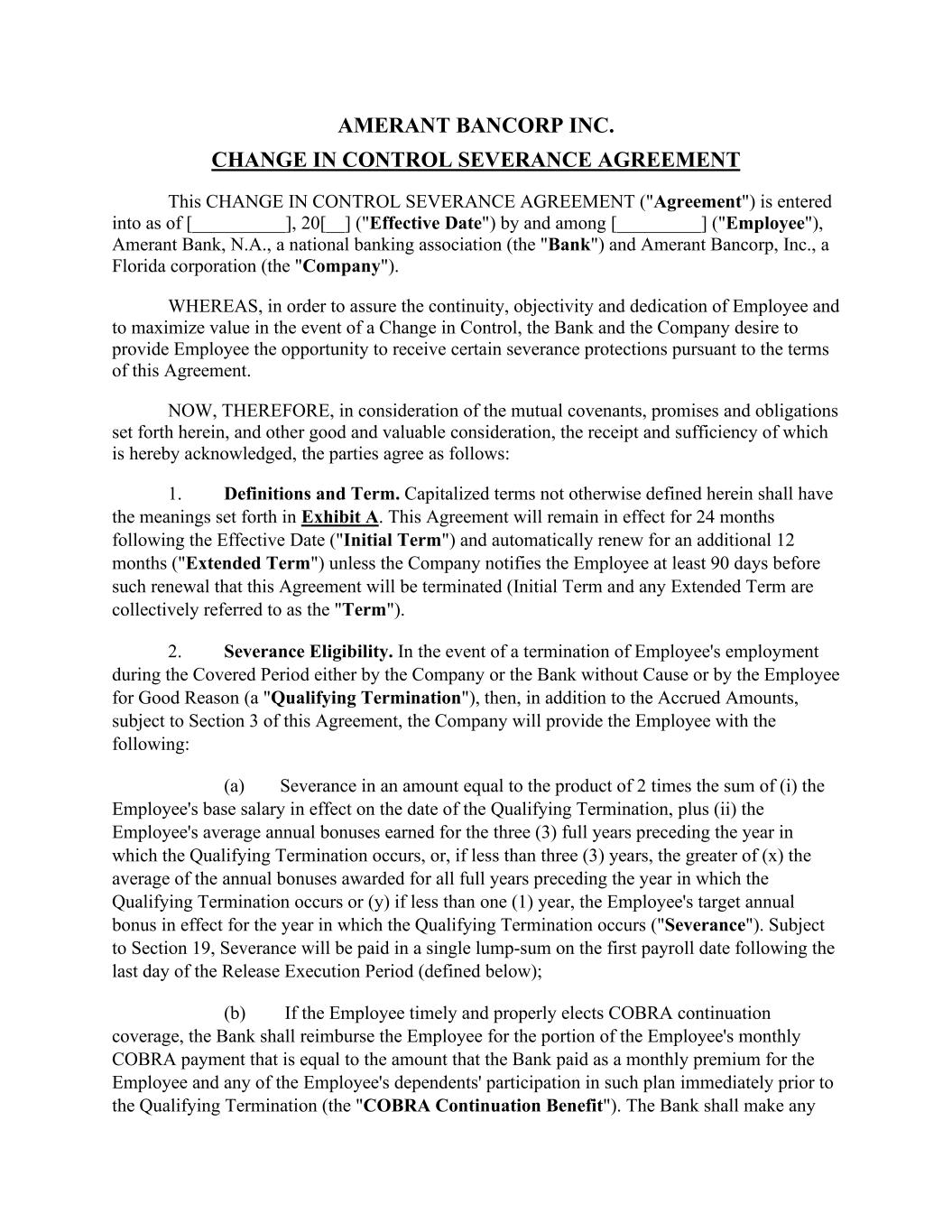 AMERANT BANCORP INC. CHANGE IN CONTROL SEVERANCE AGREEMENT This CHANGE IN CONTROL SEVERANCE AGREEMENT ("Agreement") is entered into as of [__________], 20[__] ("Effective Date") by and among [_________] ("Employee"), Amerant Bank, N.A., a national banking association (the "Bank") and Amerant Bancorp, Inc., a Florida corporation (the "Company"). WHEREAS, in order to assure the continuity, objectivity and dedication of Employee and to maximize value in the event of a Change in Control, the Bank and the Company desire to provide Employee the opportunity to receive certain severance protections pursuant to the terms of this Agreement. NOW, THEREFORE, in consideration of the mutual covenants, promises and obligations set forth herein, and other good and valuable consideration, the receipt and sufficiency of which is hereby acknowledged, the parties agree as follows: 1. Definitions and Term. Capitalized terms not otherwise defined herein shall have the meanings set forth in Exhibit A. This Agreement will remain in effect for 24 months following the Effective Date ("Initial Term") and automatically renew for an additional 12 months ("Extended Term") unless the Company notifies the Employee at least 90 days before such renewal that this Agreement will be terminated (Initial Term and any Extended Term are collectively referred to as the "Term"). 2. Severance Eligibility. In the event of a termination of Employee's employment during the Covered Period either by the Company or the Bank without Cause or by the Employee for Good Reason (a "Qualifying Termination"), then, in addition to the Accrued Amounts, subject to Section 3 of this Agreement, the Company will provide the Employee with the following: (a) Severance in an amount equal to the product of 2 times the sum of (i) the Employee's base salary in effect on the date of the Qualifying Termination, plus (ii) the Employee's average annual bonuses earned for the three (3) full years preceding the year in which the Qualifying Termination occurs, or, if less than three (3) years, the greater of (x) the average of the annual bonuses awarded for all full years preceding the year in which the Qualifying Termination occurs or (y) if less than one (1) year, the Employee's target annual bonus in effect for the year in which the Qualifying Termination occurs ("Severance"). Subject to Section 19, Severance will be paid in a single lump-sum on the first payroll date following the last day of the Release Execution Period (defined below); (b) If the Employee timely and properly elects COBRA continuation coverage, the Bank shall reimburse the Employee for the portion of the Employee's monthly COBRA payment that is equal to the amount that the Bank paid as a monthly premium for the Employee and any of the Employee's dependents' participation in such plan immediately prior to the Qualifying Termination (the "COBRA Continuation Benefit"). The Bank shall make any