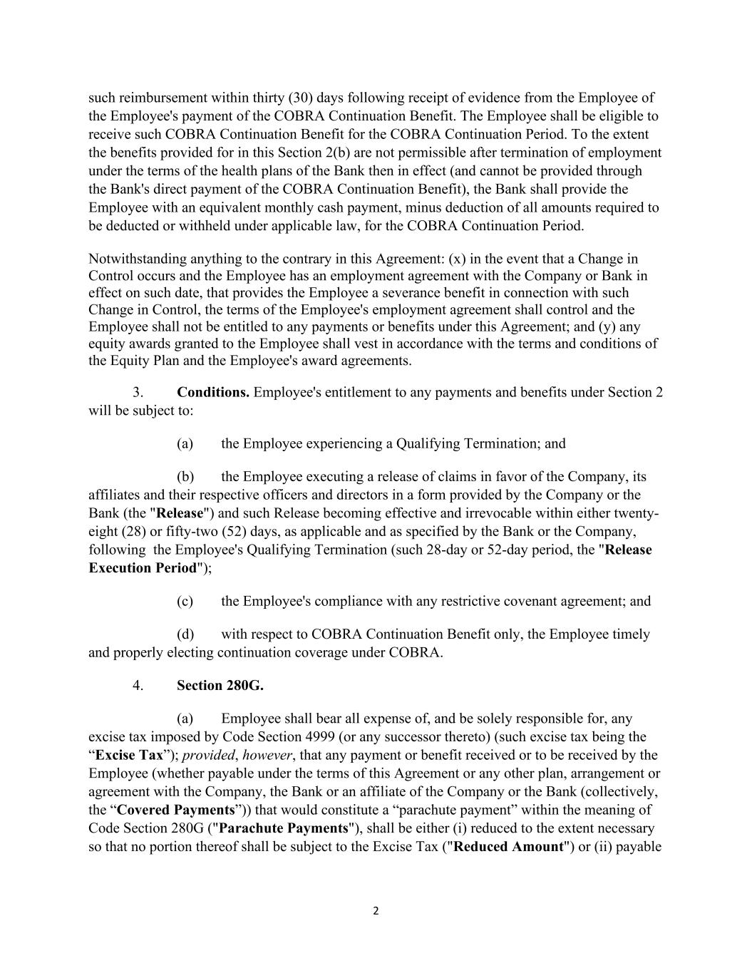 2 such reimbursement within thirty (30) days following receipt of evidence from the Employee of the Employee's payment of the COBRA Continuation Benefit. The Employee shall be eligible to receive such COBRA Continuation Benefit for the COBRA Continuation Period. To the extent the benefits provided for in this Section 2(b) are not permissible after termination of employment under the terms of the health plans of the Bank then in effect (and cannot be provided through the Bank's direct payment of the COBRA Continuation Benefit), the Bank shall provide the Employee with an equivalent monthly cash payment, minus deduction of all amounts required to be deducted or withheld under applicable law, for the COBRA Continuation Period. Notwithstanding anything to the contrary in this Agreement: (x) in the event that a Change in Control occurs and the Employee has an employment agreement with the Company or Bank in effect on such date, that provides the Employee a severance benefit in connection with such Change in Control, the terms of the Employee's employment agreement shall control and the Employee shall not be entitled to any payments or benefits under this Agreement; and (y) any equity awards granted to the Employee shall vest in accordance with the terms and conditions of the Equity Plan and the Employee's award agreements. 3. Conditions. Employee's entitlement to any payments and benefits under Section 2 will be subject to: (a) the Employee experiencing a Qualifying Termination; and (b) the Employee executing a release of claims in favor of the Company, its affiliates and their respective officers and directors in a form provided by the Company or the Bank (the "Release") and such Release becoming effective and irrevocable within either twenty- eight (28) or fifty-two (52) days, as applicable and as specified by the Bank or the Company, following the Employee's Qualifying Termination (such 28-day or 52-day period, the "Release Execution Period"); (c) the Employee's compliance with any restrictive covenant agreement; and (d) with respect to COBRA Continuation Benefit only, the Employee timely and properly electing continuation coverage under COBRA. 4. Section 280G. (a) Employee shall bear all expense of, and be solely responsible for, any excise tax imposed by Code Section 4999 (or any successor thereto) (such excise tax being the “Excise Tax”); provided, however, that any payment or benefit received or to be received by the Employee (whether payable under the terms of this Agreement or any other plan, arrangement or agreement with the Company, the Bank or an affiliate of the Company or the Bank (collectively, the “Covered Payments”)) that would constitute a “parachute payment” within the meaning of Code Section 280G ("Parachute Payments"), shall be either (i) reduced to the extent necessary so that no portion thereof shall be subject to the Excise Tax ("Reduced Amount") or (ii) payable