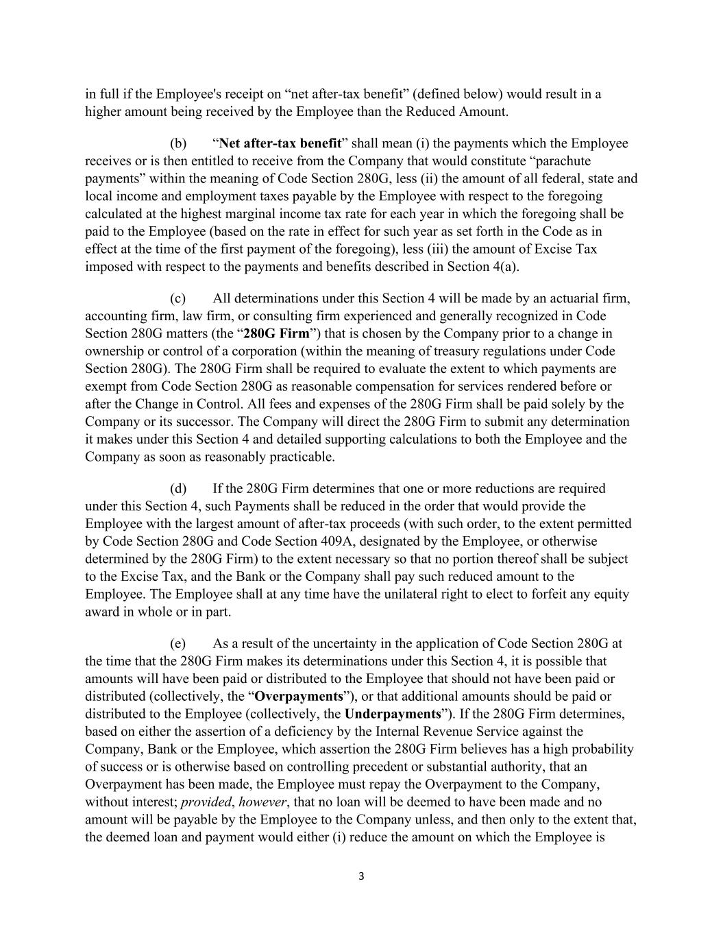 3 in full if the Employee's receipt on “net after-tax benefit” (defined below) would result in a higher amount being received by the Employee than the Reduced Amount. (b) “Net after-tax benefit” shall mean (i) the payments which the Employee receives or is then entitled to receive from the Company that would constitute “parachute payments” within the meaning of Code Section 280G, less (ii) the amount of all federal, state and local income and employment taxes payable by the Employee with respect to the foregoing calculated at the highest marginal income tax rate for each year in which the foregoing shall be paid to the Employee (based on the rate in effect for such year as set forth in the Code as in effect at the time of the first payment of the foregoing), less (iii) the amount of Excise Tax imposed with respect to the payments and benefits described in Section 4(a). (c) All determinations under this Section 4 will be made by an actuarial firm, accounting firm, law firm, or consulting firm experienced and generally recognized in Code Section 280G matters (the “280G Firm”) that is chosen by the Company prior to a change in ownership or control of a corporation (within the meaning of treasury regulations under Code Section 280G). The 280G Firm shall be required to evaluate the extent to which payments are exempt from Code Section 280G as reasonable compensation for services rendered before or after the Change in Control. All fees and expenses of the 280G Firm shall be paid solely by the Company or its successor. The Company will direct the 280G Firm to submit any determination it makes under this Section 4 and detailed supporting calculations to both the Employee and the Company as soon as reasonably practicable. (d) If the 280G Firm determines that one or more reductions are required under this Section 4, such Payments shall be reduced in the order that would provide the Employee with the largest amount of after-tax proceeds (with such order, to the extent permitted by Code Section 280G and Code Section 409A, designated by the Employee, or otherwise determined by the 280G Firm) to the extent necessary so that no portion thereof shall be subject to the Excise Tax, and the Bank or the Company shall pay such reduced amount to the Employee. The Employee shall at any time have the unilateral right to elect to forfeit any equity award in whole or in part. (e) As a result of the uncertainty in the application of Code Section 280G at the time that the 280G Firm makes its determinations under this Section 4, it is possible that amounts will have been paid or distributed to the Employee that should not have been paid or distributed (collectively, the “Overpayments”), or that additional amounts should be paid or distributed to the Employee (collectively, the Underpayments”). If the 280G Firm determines, based on either the assertion of a deficiency by the Internal Revenue Service against the Company, Bank or the Employee, which assertion the 280G Firm believes has a high probability of success or is otherwise based on controlling precedent or substantial authority, that an Overpayment has been made, the Employee must repay the Overpayment to the Company, without interest; provided, however, that no loan will be deemed to have been made and no amount will be payable by the Employee to the Company unless, and then only to the extent that, the deemed loan and payment would either (i) reduce the amount on which the Employee is