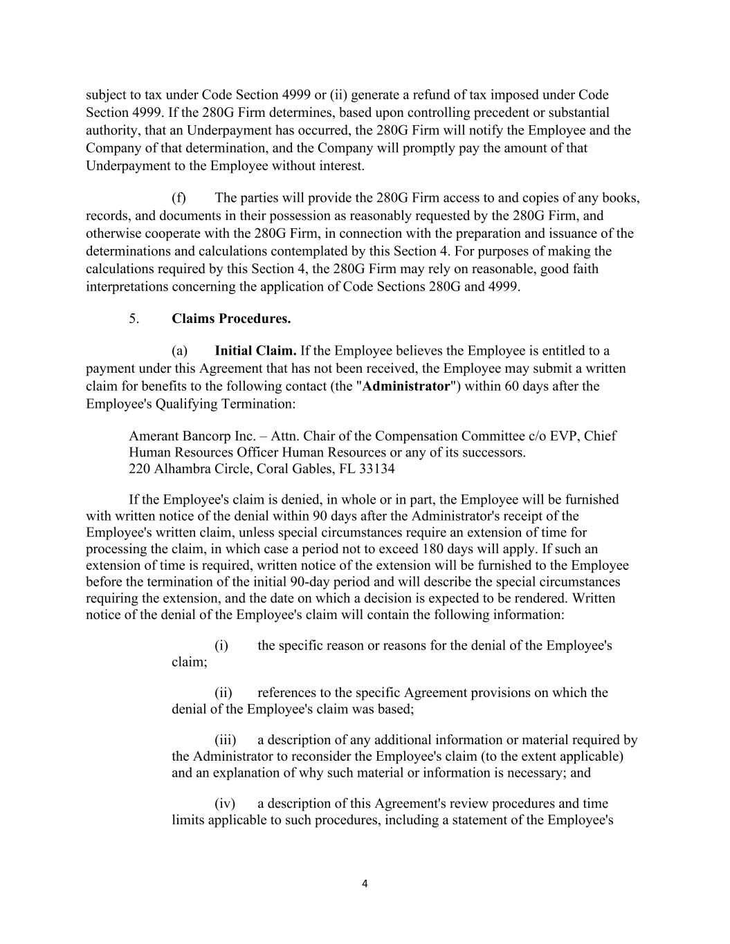 4 subject to tax under Code Section 4999 or (ii) generate a refund of tax imposed under Code Section 4999. If the 280G Firm determines, based upon controlling precedent or substantial authority, that an Underpayment has occurred, the 280G Firm will notify the Employee and the Company of that determination, and the Company will promptly pay the amount of that Underpayment to the Employee without interest. (f) The parties will provide the 280G Firm access to and copies of any books, records, and documents in their possession as reasonably requested by the 280G Firm, and otherwise cooperate with the 280G Firm, in connection with the preparation and issuance of the determinations and calculations contemplated by this Section 4. For purposes of making the calculations required by this Section 4, the 280G Firm may rely on reasonable, good faith interpretations concerning the application of Code Sections 280G and 4999. 5. Claims Procedures. (a) Initial Claim. If the Employee believes the Employee is entitled to a payment under this Agreement that has not been received, the Employee may submit a written claim for benefits to the following contact (the "Administrator") within 60 days after the Employee's Qualifying Termination: Amerant Bancorp Inc. – Attn. Chair of the Compensation Committee c/o EVP, Chief Human Resources Officer Human Resources or any of its successors. 220 Alhambra Circle, Coral Gables, FL 33134 If the Employee's claim is denied, in whole or in part, the Employee will be furnished with written notice of the denial within 90 days after the Administrator's receipt of the Employee's written claim, unless special circumstances require an extension of time for processing the claim, in which case a period not to exceed 180 days will apply. If such an extension of time is required, written notice of the extension will be furnished to the Employee before the termination of the initial 90-day period and will describe the special circumstances requiring the extension, and the date on which a decision is expected to be rendered. Written notice of the denial of the Employee's claim will contain the following information: (i) the specific reason or reasons for the denial of the Employee's claim; (ii) references to the specific Agreement provisions on which the denial of the Employee's claim was based; (iii) a description of any additional information or material required by the Administrator to reconsider the Employee's claim (to the extent applicable) and an explanation of why such material or information is necessary; and (iv) a description of this Agreement's review procedures and time limits applicable to such procedures, including a statement of the Employee's
