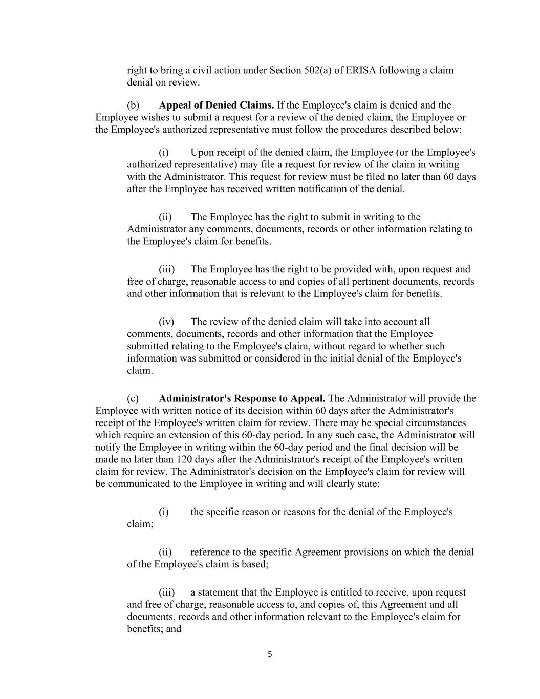 5 right to bring a civil action under Section 502(a) of ERISA following a claim denial on review. (b) Appeal of Denied Claims. If the Employee's claim is denied and the Employee wishes to submit a request for a review of the denied claim, the Employee or the Employee's authorized representative must follow the procedures described below: (i) Upon receipt of the denied claim, the Employee (or the Employee's authorized representative) may file a request for review of the claim in writing with the Administrator. This request for review must be filed no later than 60 days after the Employee has received written notification of the denial. (ii) The Employee has the right to submit in writing to the Administrator any comments, documents, records or other information relating to the Employee's claim for benefits. (iii) The Employee has the right to be provided with, upon request and free of charge, reasonable access to and copies of all pertinent documents, records and other information that is relevant to the Employee's claim for benefits. (iv) The review of the denied claim will take into account all comments, documents, records and other information that the Employee submitted relating to the Employee's claim, without regard to whether such information was submitted or considered in the initial denial of the Employee's claim. (c) Administrator's Response to Appeal. The Administrator will provide the Employee with written notice of its decision within 60 days after the Administrator's receipt of the Employee's written claim for review. There may be special circumstances which require an extension of this 60-day period. In any such case, the Administrator will notify the Employee in writing within the 60-day period and the final decision will be made no later than 120 days after the Administrator's receipt of the Employee's written claim for review. The Administrator's decision on the Employee's claim for review will be communicated to the Employee in writing and will clearly state: (i) the specific reason or reasons for the denial of the Employee's claim; (ii) reference to the specific Agreement provisions on which the denial of the Employee's claim is based; (iii) a statement that the Employee is entitled to receive, upon request and free of charge, reasonable access to, and copies of, this Agreement and all documents, records and other information relevant to the Employee's claim for benefits; and