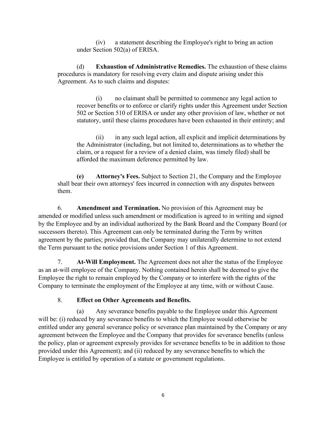 6 (iv) a statement describing the Employee's right to bring an action under Section 502(a) of ERISA. (d) Exhaustion of Administrative Remedies. The exhaustion of these claims procedures is mandatory for resolving every claim and dispute arising under this Agreement. As to such claims and disputes: (i) no claimant shall be permitted to commence any legal action to recover benefits or to enforce or clarify rights under this Agreement under Section 502 or Section 510 of ERISA or under any other provision of law, whether or not statutory, until these claims procedures have been exhausted in their entirety; and (ii) in any such legal action, all explicit and implicit determinations by the Administrator (including, but not limited to, determinations as to whether the claim, or a request for a review of a denied claim, was timely filed) shall be afforded the maximum deference permitted by law. (e) Attorney's Fees. Subject to Section 21, the Company and the Employee shall bear their own attorneys' fees incurred in connection with any disputes between them. 6. Amendment and Termination. No provision of this Agreement may be amended or modified unless such amendment or modification is agreed to in writing and signed by the Employee and by an individual authorized by the Bank Board and the Company Board (or successors thereto). This Agreement can only be terminated during the Term by written agreement by the parties; provided that, the Company may unilaterally determine to not extend the Term pursuant to the notice provisions under Section 1 of this Agreement. 7. At-Will Employment. The Agreement does not alter the status of the Employee as an at-will employee of the Company. Nothing contained herein shall be deemed to give the Employee the right to remain employed by the Company or to interfere with the rights of the Company to terminate the employment of the Employee at any time, with or without Cause. 8. Effect on Other Agreements and Benefits. (a) Any severance benefits payable to the Employee under this Agreement will be: (i) reduced by any severance benefits to which the Employee would otherwise be entitled under any general severance policy or severance plan maintained by the Company or any agreement between the Employee and the Company that provides for severance benefits (unless the policy, plan or agreement expressly provides for severance benefits to be in addition to those provided under this Agreement); and (ii) reduced by any severance benefits to which the Employee is entitled by operation of a statute or government regulations.