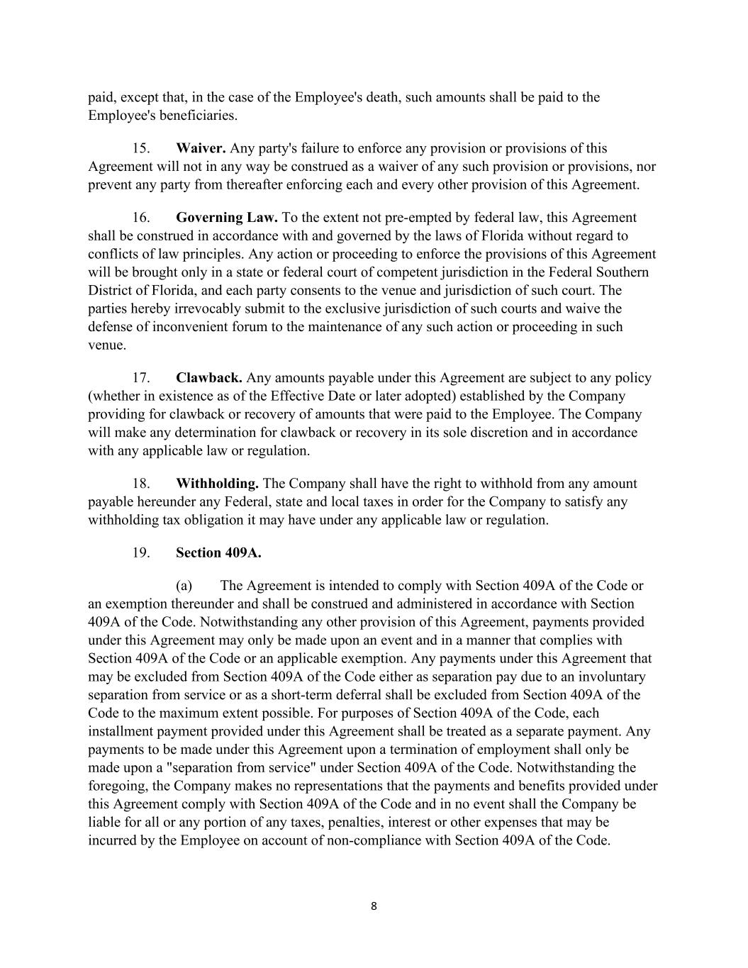 8 paid, except that, in the case of the Employee's death, such amounts shall be paid to the Employee's beneficiaries. 15. Waiver. Any party's failure to enforce any provision or provisions of this Agreement will not in any way be construed as a waiver of any such provision or provisions, nor prevent any party from thereafter enforcing each and every other provision of this Agreement. 16. Governing Law. To the extent not pre-empted by federal law, this Agreement shall be construed in accordance with and governed by the laws of Florida without regard to conflicts of law principles. Any action or proceeding to enforce the provisions of this Agreement will be brought only in a state or federal court of competent jurisdiction in the Federal Southern District of Florida, and each party consents to the venue and jurisdiction of such court. The parties hereby irrevocably submit to the exclusive jurisdiction of such courts and waive the defense of inconvenient forum to the maintenance of any such action or proceeding in such venue. 17. Clawback. Any amounts payable under this Agreement are subject to any policy (whether in existence as of the Effective Date or later adopted) established by the Company providing for clawback or recovery of amounts that were paid to the Employee. The Company will make any determination for clawback or recovery in its sole discretion and in accordance with any applicable law or regulation. 18. Withholding. The Company shall have the right to withhold from any amount payable hereunder any Federal, state and local taxes in order for the Company to satisfy any withholding tax obligation it may have under any applicable law or regulation. 19. Section 409A. (a) The Agreement is intended to comply with Section 409A of the Code or an exemption thereunder and shall be construed and administered in accordance with Section 409A of the Code. Notwithstanding any other provision of this Agreement, payments provided under this Agreement may only be made upon an event and in a manner that complies with Section 409A of the Code or an applicable exemption. Any payments under this Agreement that may be excluded from Section 409A of the Code either as separation pay due to an involuntary separation from service or as a short-term deferral shall be excluded from Section 409A of the Code to the maximum extent possible. For purposes of Section 409A of the Code, each installment payment provided under this Agreement shall be treated as a separate payment. Any payments to be made under this Agreement upon a termination of employment shall only be made upon a "separation from service" under Section 409A of the Code. Notwithstanding the foregoing, the Company makes no representations that the payments and benefits provided under this Agreement comply with Section 409A of the Code and in no event shall the Company be liable for all or any portion of any taxes, penalties, interest or other expenses that may be incurred by the Employee on account of non-compliance with Section 409A of the Code.