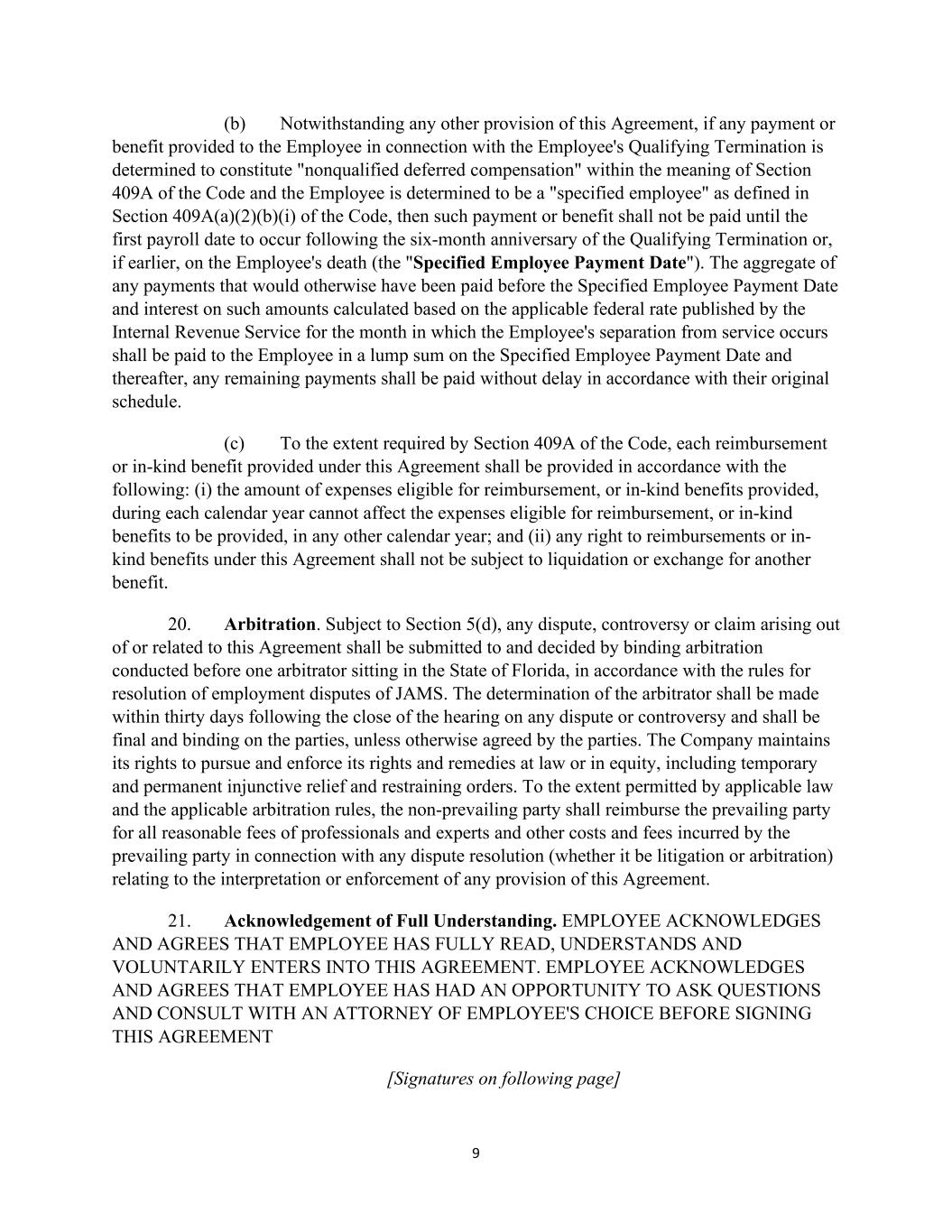 9 (b) Notwithstanding any other provision of this Agreement, if any payment or benefit provided to the Employee in connection with the Employee's Qualifying Termination is determined to constitute "nonqualified deferred compensation" within the meaning of Section 409A of the Code and the Employee is determined to be a "specified employee" as defined in Section 409A(a)(2)(b)(i) of the Code, then such payment or benefit shall not be paid until the first payroll date to occur following the six-month anniversary of the Qualifying Termination or, if earlier, on the Employee's death (the "Specified Employee Payment Date"). The aggregate of any payments that would otherwise have been paid before the Specified Employee Payment Date and interest on such amounts calculated based on the applicable federal rate published by the Internal Revenue Service for the month in which the Employee's separation from service occurs shall be paid to the Employee in a lump sum on the Specified Employee Payment Date and thereafter, any remaining payments shall be paid without delay in accordance with their original schedule. (c) To the extent required by Section 409A of the Code, each reimbursement or in-kind benefit provided under this Agreement shall be provided in accordance with the following: (i) the amount of expenses eligible for reimbursement, or in-kind benefits provided, during each calendar year cannot affect the expenses eligible for reimbursement, or in-kind benefits to be provided, in any other calendar year; and (ii) any right to reimbursements or in- kind benefits under this Agreement shall not be subject to liquidation or exchange for another benefit. 20. Arbitration. Subject to Section 5(d), any dispute, controversy or claim arising out of or related to this Agreement shall be submitted to and decided by binding arbitration conducted before one arbitrator sitting in the State of Florida, in accordance with the rules for resolution of employment disputes of JAMS. The determination of the arbitrator shall be made within thirty days following the close of the hearing on any dispute or controversy and shall be final and binding on the parties, unless otherwise agreed by the parties. The Company maintains its rights to pursue and enforce its rights and remedies at law or in equity, including temporary and permanent injunctive relief and restraining orders. To the extent permitted by applicable law and the applicable arbitration rules, the non-prevailing party shall reimburse the prevailing party for all reasonable fees of professionals and experts and other costs and fees incurred by the prevailing party in connection with any dispute resolution (whether it be litigation or arbitration) relating to the interpretation or enforcement of any provision of this Agreement. 21. Acknowledgement of Full Understanding. EMPLOYEE ACKNOWLEDGES AND AGREES THAT EMPLOYEE HAS FULLY READ, UNDERSTANDS AND VOLUNTARILY ENTERS INTO THIS AGREEMENT. EMPLOYEE ACKNOWLEDGES AND AGREES THAT EMPLOYEE HAS HAD AN OPPORTUNITY TO ASK QUESTIONS AND CONSULT WITH AN ATTORNEY OF EMPLOYEE'S CHOICE BEFORE SIGNING THIS AGREEMENT [Signatures on following page]