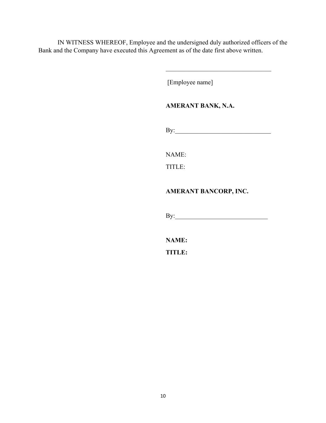 10 IN WITNESS WHEREOF, Employee and the undersigned duly authorized officers of the Bank and the Company have executed this Agreement as of the date first above written. _________________________________ [Employee name] AMERANT BANK, N.A. By:______________________________ NAME: TITLE: AMERANT BANCORP, INC. By:_____________________________ NAME: TITLE: