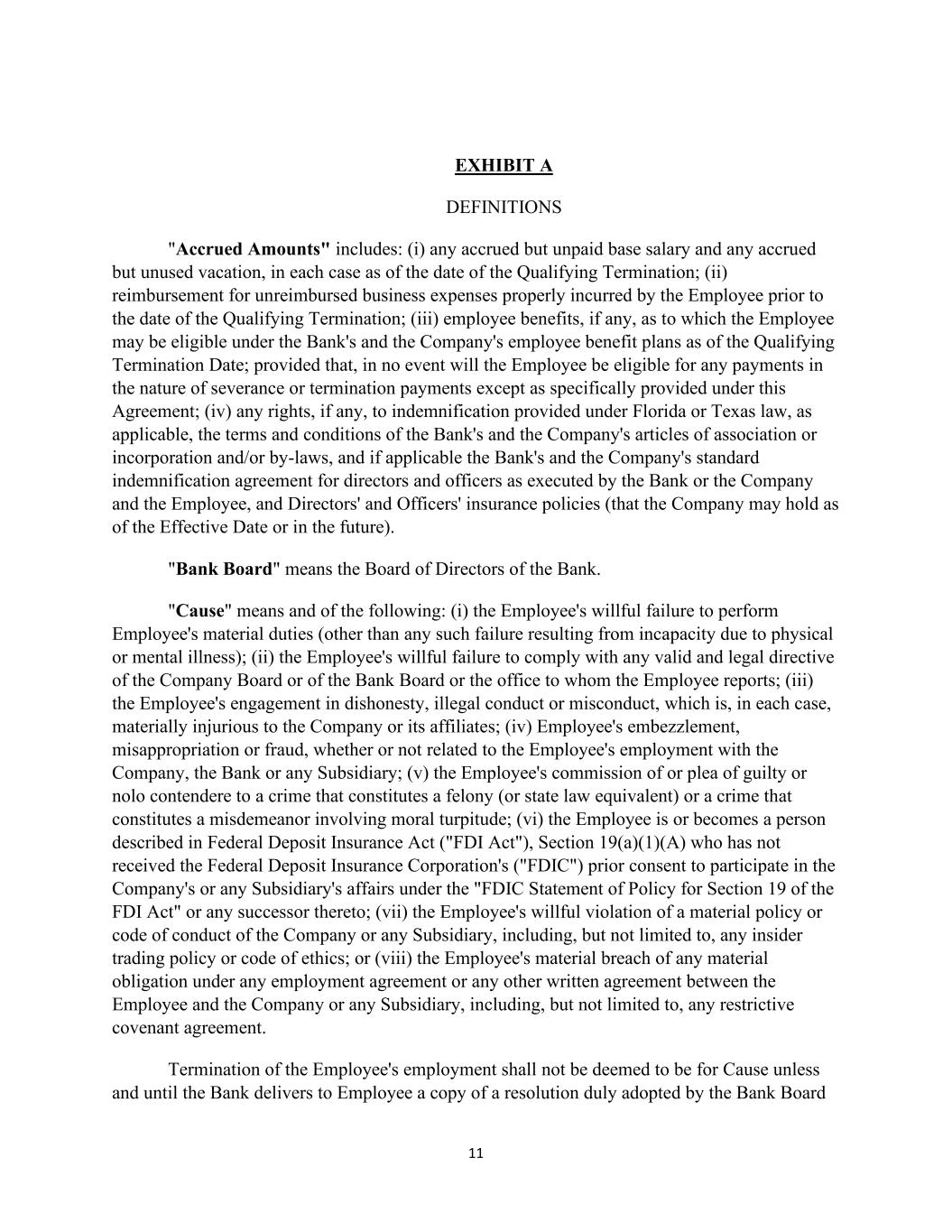 11 EXHIBIT A DEFINITIONS "Accrued Amounts" includes: (i) any accrued but unpaid base salary and any accrued but unused vacation, in each case as of the date of the Qualifying Termination; (ii) reimbursement for unreimbursed business expenses properly incurred by the Employee prior to the date of the Qualifying Termination; (iii) employee benefits, if any, as to which the Employee may be eligible under the Bank's and the Company's employee benefit plans as of the Qualifying Termination Date; provided that, in no event will the Employee be eligible for any payments in the nature of severance or termination payments except as specifically provided under this Agreement; (iv) any rights, if any, to indemnification provided under Florida or Texas law, as applicable, the terms and conditions of the Bank's and the Company's articles of association or incorporation and/or by-laws, and if applicable the Bank's and the Company's standard indemnification agreement for directors and officers as executed by the Bank or the Company and the Employee, and Directors' and Officers' insurance policies (that the Company may hold as of the Effective Date or in the future). "Bank Board" means the Board of Directors of the Bank. "Cause" means and of the following: (i) the Employee's willful failure to perform Employee's material duties (other than any such failure resulting from incapacity due to physical or mental illness); (ii) the Employee's willful failure to comply with any valid and legal directive of the Company Board or of the Bank Board or the office to whom the Employee reports; (iii) the Employee's engagement in dishonesty, illegal conduct or misconduct, which is, in each case, materially injurious to the Company or its affiliates; (iv) Employee's embezzlement, misappropriation or fraud, whether or not related to the Employee's employment with the Company, the Bank or any Subsidiary; (v) the Employee's commission of or plea of guilty or nolo contendere to a crime that constitutes a felony (or state law equivalent) or a crime that constitutes a misdemeanor involving moral turpitude; (vi) the Employee is or becomes a person described in Federal Deposit Insurance Act ("FDI Act"), Section 19(a)(1)(A) who has not received the Federal Deposit Insurance Corporation's ("FDIC") prior consent to participate in the Company's or any Subsidiary's affairs under the "FDIC Statement of Policy for Section 19 of the FDI Act" or any successor thereto; (vii) the Employee's willful violation of a material policy or code of conduct of the Company or any Subsidiary, including, but not limited to, any insider trading policy or code of ethics; or (viii) the Employee's material breach of any material obligation under any employment agreement or any other written agreement between the Employee and the Company or any Subsidiary, including, but not limited to, any restrictive covenant agreement. Termination of the Employee's employment shall not be deemed to be for Cause unless and until the Bank delivers to Employee a copy of a resolution duly adopted by the Bank Board