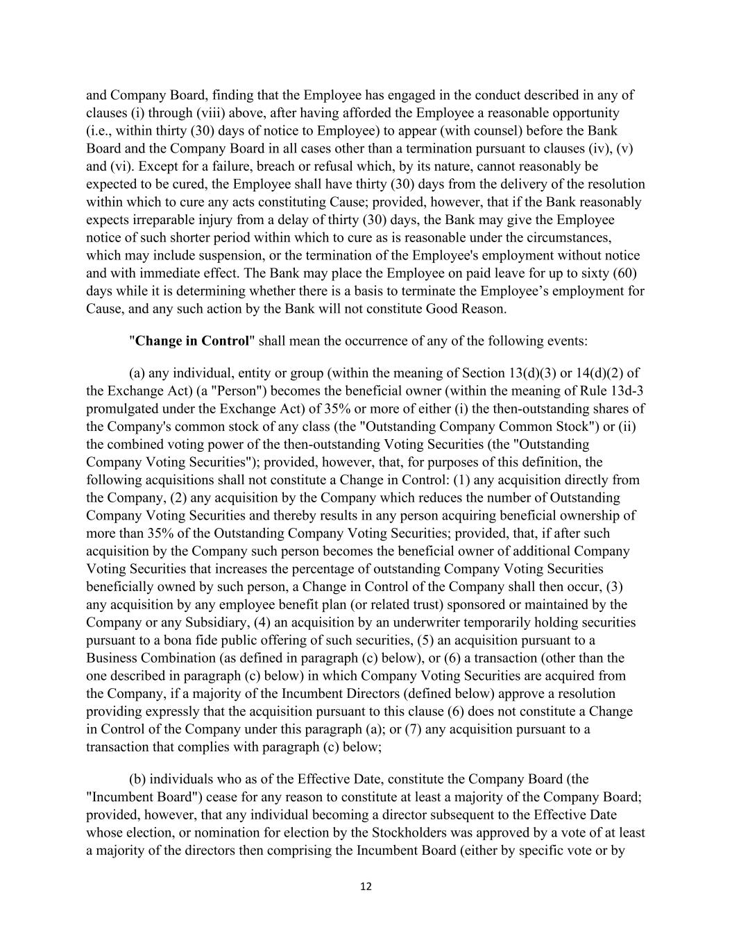 12 and Company Board, finding that the Employee has engaged in the conduct described in any of clauses (i) through (viii) above, after having afforded the Employee a reasonable opportunity (i.e., within thirty (30) days of notice to Employee) to appear (with counsel) before the Bank Board and the Company Board in all cases other than a termination pursuant to clauses (iv), (v) and (vi). Except for a failure, breach or refusal which, by its nature, cannot reasonably be expected to be cured, the Employee shall have thirty (30) days from the delivery of the resolution within which to cure any acts constituting Cause; provided, however, that if the Bank reasonably expects irreparable injury from a delay of thirty (30) days, the Bank may give the Employee notice of such shorter period within which to cure as is reasonable under the circumstances, which may include suspension, or the termination of the Employee's employment without notice and with immediate effect. The Bank may place the Employee on paid leave for up to sixty (60) days while it is determining whether there is a basis to terminate the Employee’s employment for Cause, and any such action by the Bank will not constitute Good Reason. "Change in Control" shall mean the occurrence of any of the following events: (a) any individual, entity or group (within the meaning of Section 13(d)(3) or 14(d)(2) of the Exchange Act) (a "Person") becomes the beneficial owner (within the meaning of Rule 13d-3 promulgated under the Exchange Act) of 35% or more of either (i) the then-outstanding shares of the Company's common stock of any class (the "Outstanding Company Common Stock") or (ii) the combined voting power of the then-outstanding Voting Securities (the "Outstanding Company Voting Securities"); provided, however, that, for purposes of this definition, the following acquisitions shall not constitute a Change in Control: (1) any acquisition directly from the Company, (2) any acquisition by the Company which reduces the number of Outstanding Company Voting Securities and thereby results in any person acquiring beneficial ownership of more than 35% of the Outstanding Company Voting Securities; provided, that, if after such acquisition by the Company such person becomes the beneficial owner of additional Company Voting Securities that increases the percentage of outstanding Company Voting Securities beneficially owned by such person, a Change in Control of the Company shall then occur, (3) any acquisition by any employee benefit plan (or related trust) sponsored or maintained by the Company or any Subsidiary, (4) an acquisition by an underwriter temporarily holding securities pursuant to a bona fide public offering of such securities, (5) an acquisition pursuant to a Business Combination (as defined in paragraph (c) below), or (6) a transaction (other than the one described in paragraph (c) below) in which Company Voting Securities are acquired from the Company, if a majority of the Incumbent Directors (defined below) approve a resolution providing expressly that the acquisition pursuant to this clause (6) does not constitute a Change in Control of the Company under this paragraph (a); or (7) any acquisition pursuant to a transaction that complies with paragraph (c) below; (b) individuals who as of the Effective Date, constitute the Company Board (the "Incumbent Board") cease for any reason to constitute at least a majority of the Company Board; provided, however, that any individual becoming a director subsequent to the Effective Date whose election, or nomination for election by the Stockholders was approved by a vote of at least a majority of the directors then comprising the Incumbent Board (either by specific vote or by