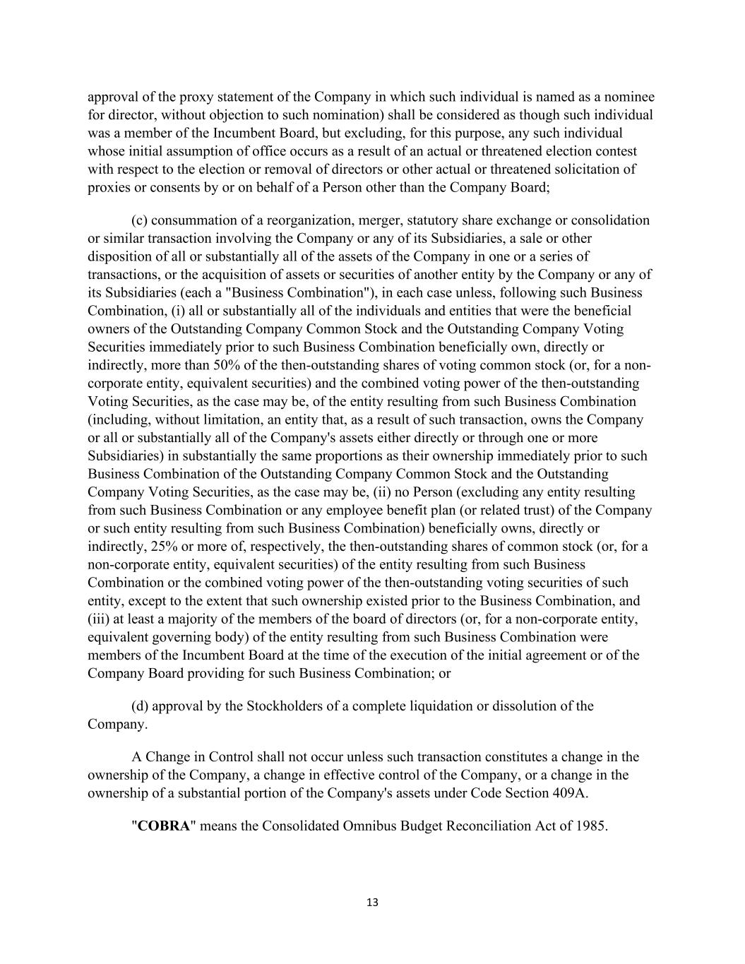 13 approval of the proxy statement of the Company in which such individual is named as a nominee for director, without objection to such nomination) shall be considered as though such individual was a member of the Incumbent Board, but excluding, for this purpose, any such individual whose initial assumption of office occurs as a result of an actual or threatened election contest with respect to the election or removal of directors or other actual or threatened solicitation of proxies or consents by or on behalf of a Person other than the Company Board; (c) consummation of a reorganization, merger, statutory share exchange or consolidation or similar transaction involving the Company or any of its Subsidiaries, a sale or other disposition of all or substantially all of the assets of the Company in one or a series of transactions, or the acquisition of assets or securities of another entity by the Company or any of its Subsidiaries (each a "Business Combination"), in each case unless, following such Business Combination, (i) all or substantially all of the individuals and entities that were the beneficial owners of the Outstanding Company Common Stock and the Outstanding Company Voting Securities immediately prior to such Business Combination beneficially own, directly or indirectly, more than 50% of the then-outstanding shares of voting common stock (or, for a non- corporate entity, equivalent securities) and the combined voting power of the then-outstanding Voting Securities, as the case may be, of the entity resulting from such Business Combination (including, without limitation, an entity that, as a result of such transaction, owns the Company or all or substantially all of the Company's assets either directly or through one or more Subsidiaries) in substantially the same proportions as their ownership immediately prior to such Business Combination of the Outstanding Company Common Stock and the Outstanding Company Voting Securities, as the case may be, (ii) no Person (excluding any entity resulting from such Business Combination or any employee benefit plan (or related trust) of the Company or such entity resulting from such Business Combination) beneficially owns, directly or indirectly, 25% or more of, respectively, the then-outstanding shares of common stock (or, for a non-corporate entity, equivalent securities) of the entity resulting from such Business Combination or the combined voting power of the then-outstanding voting securities of such entity, except to the extent that such ownership existed prior to the Business Combination, and (iii) at least a majority of the members of the board of directors (or, for a non-corporate entity, equivalent governing body) of the entity resulting from such Business Combination were members of the Incumbent Board at the time of the execution of the initial agreement or of the Company Board providing for such Business Combination; or (d) approval by the Stockholders of a complete liquidation or dissolution of the Company. A Change in Control shall not occur unless such transaction constitutes a change in the ownership of the Company, a change in effective control of the Company, or a change in the ownership of a substantial portion of the Company's assets under Code Section 409A. "COBRA" means the Consolidated Omnibus Budget Reconciliation Act of 1985.