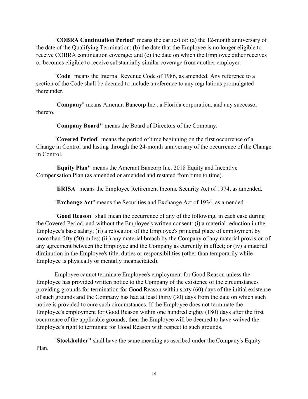 14 "COBRA Continuation Period" means the earliest of: (a) the 12-month anniversary of the date of the Qualifying Termination; (b) the date that the Employee is no longer eligible to receive COBRA continuation coverage; and (c) the date on which the Employee either receives or becomes eligible to receive substantially similar coverage from another employer. "Code" means the Internal Revenue Code of 1986, as amended. Any reference to a section of the Code shall be deemed to include a reference to any regulations promulgated thereunder. "Company" means Amerant Bancorp Inc., a Florida corporation, and any successor thereto. "Company Board" means the Board of Directors of the Company. "Covered Period" means the period of time beginning on the first occurrence of a Change in Control and lasting through the 24-month anniversary of the occurrence of the Change in Control. "Equity Plan" means the Amerant Bancorp Inc. 2018 Equity and Incentive Compensation Plan (as amended or amended and restated from time to time). "ERISA" means the Employee Retirement Income Security Act of 1974, as amended. "Exchange Act" means the Securities and Exchange Act of 1934, as amended. "Good Reason" shall mean the occurrence of any of the following, in each case during the Covered Period, and without the Employee's written consent: (i) a material reduction in the Employee's base salary; (ii) a relocation of the Employee's principal place of employment by more than fifty (50) miles; (iii) any material breach by the Company of any material provision of any agreement between the Employee and the Company as currently in effect; or (iv) a material diminution in the Employee's title, duties or responsibilities (other than temporarily while Employee is physically or mentally incapacitated). Employee cannot terminate Employee's employment for Good Reason unless the Employee has provided written notice to the Company of the existence of the circumstances providing grounds for termination for Good Reason within sixty (60) days of the initial existence of such grounds and the Company has had at least thirty (30) days from the date on which such notice is provided to cure such circumstances. If the Employee does not terminate the Employee's employment for Good Reason within one hundred eighty (180) days after the first occurrence of the applicable grounds, then the Employee will be deemed to have waived the Employee's right to terminate for Good Reason with respect to such grounds. "Stockholder" shall have the same meaning as ascribed under the Company's Equity Plan.