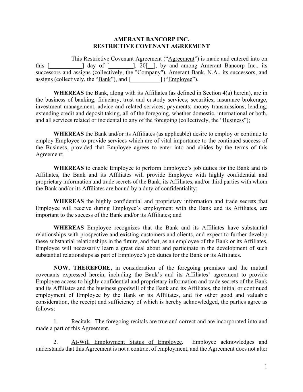 1 AMERANT BANCORP INC. RESTRICTIVE COVENANT AGREEMENT This Restrictive Covenant Agreement (“Agreement”) is made and entered into on this [___________] day of [________], 20[__], by and among Amerant Bancorp Inc., its successors and assigns (collectively, the "Company"), Amerant Bank, N.A., its successors, and assigns (collectively, the “Bank”), and [__________] (“Employee”). WHEREAS the Bank, along with its Affiliates (as defined in Section 4(a) herein), are in the business of banking; fiduciary, trust and custody services; securities, insurance brokerage, investment management, advice and related services; payments; money transmissions; lending; extending credit and deposit taking, all of the foregoing, whether domestic, international or both, and all services related or incidental to any of the foregoing (collectively, the “Business”); WHEREAS the Bank and/or its Affiliates (as applicable) desire to employ or continue to employ Employee to provide services which are of vital importance to the continued success of the Business, provided that Employee agrees to enter into and abides by the terms of this Agreement; WHEREAS to enable Employee to perform Employee’s job duties for the Bank and its Affiliates, the Bank and its Affiliates will provide Employee with highly confidential and proprietary information and trade secrets of the Bank, its Affiliates, and/or third parties with whom the Bank and/or its Affiliates are bound by a duty of confidentiality; WHEREAS the highly confidential and proprietary information and trade secrets that Employee will receive during Employee’s employment with the Bank and its Affiliates, are important to the success of the Bank and/or its Affiliates; and WHEREAS Employee recognizes that the Bank and its Affiliates have substantial relationships with prospective and existing customers and clients, and expect to further develop these substantial relationships in the future, and that, as an employee of the Bank or its Affiliates, Employee will necessarily learn a great deal about and participate in the development of such substantial relationships as part of Employee’s job duties for the Bank or its Affiliates. NOW, THEREFORE, in consideration of the foregoing premises and the mutual covenants expressed herein, including the Bank’s and its Affiliates’ agreement to provide Employee access to highly confidential and proprietary information and trade secrets of the Bank and its Affiliates and the business goodwill of the Bank and its Affiliates, the initial or continued employment of Employee by the Bank or its Affiliates, and for other good and valuable consideration, the receipt and sufficiency of which is hereby acknowledged, the parties agree as follows: 1. Recitals. The foregoing recitals are true and correct and are incorporated into and made a part of this Agreement. 2. At-Will Employment Status of Employee. Employee acknowledges and understands that this Agreement is not a contract of employment, and the Agreement does not alter