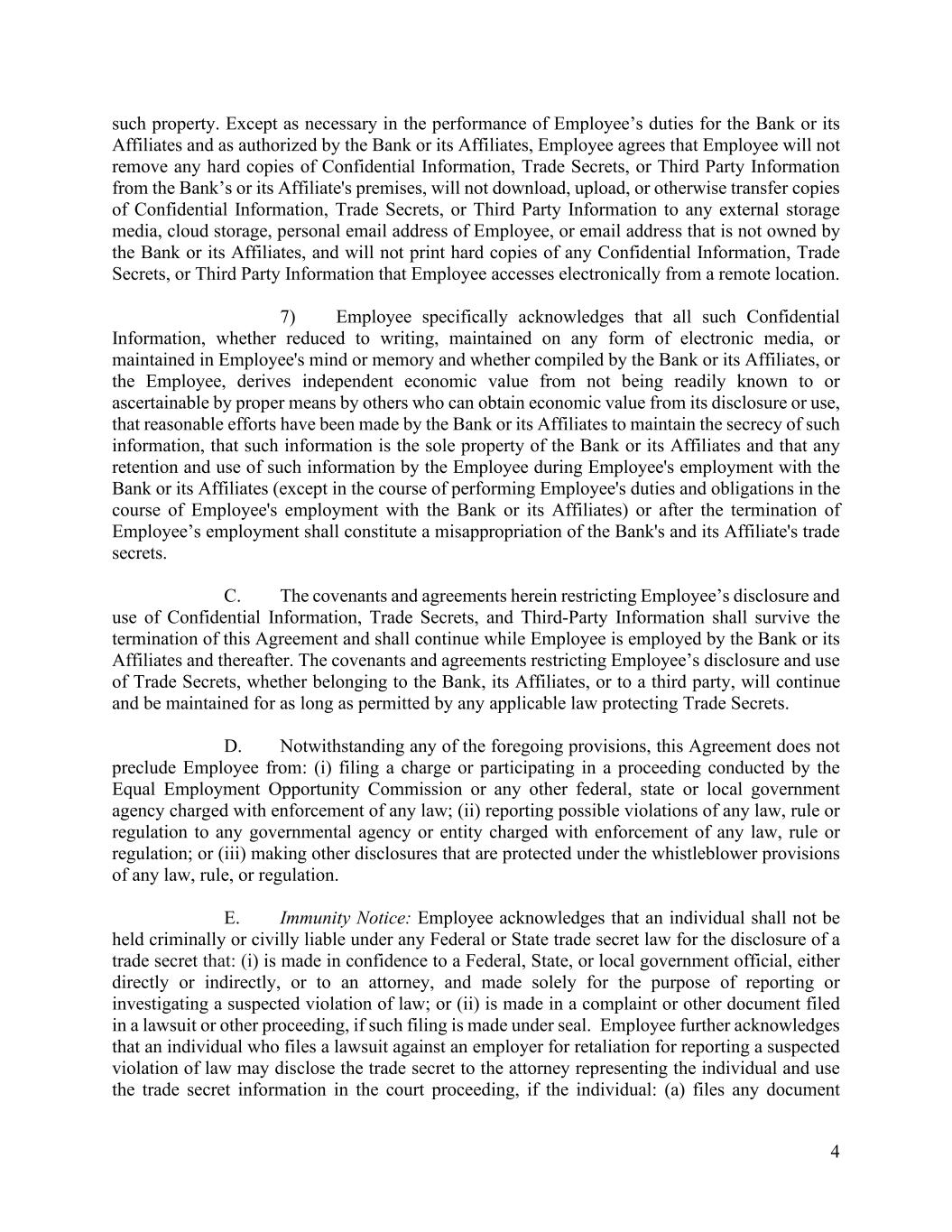 4 such property. Except as necessary in the performance of Employee’s duties for the Bank or its Affiliates and as authorized by the Bank or its Affiliates, Employee agrees that Employee will not remove any hard copies of Confidential Information, Trade Secrets, or Third Party Information from the Bank’s or its Affiliate's premises, will not download, upload, or otherwise transfer copies of Confidential Information, Trade Secrets, or Third Party Information to any external storage media, cloud storage, personal email address of Employee, or email address that is not owned by the Bank or its Affiliates, and will not print hard copies of any Confidential Information, Trade Secrets, or Third Party Information that Employee accesses electronically from a remote location. 7) Employee specifically acknowledges that all such Confidential Information, whether reduced to writing, maintained on any form of electronic media, or maintained in Employee's mind or memory and whether compiled by the Bank or its Affiliates, or the Employee, derives independent economic value from not being readily known to or ascertainable by proper means by others who can obtain economic value from its disclosure or use, that reasonable efforts have been made by the Bank or its Affiliates to maintain the secrecy of such information, that such information is the sole property of the Bank or its Affiliates and that any retention and use of such information by the Employee during Employee's employment with the Bank or its Affiliates (except in the course of performing Employee's duties and obligations in the course of Employee's employment with the Bank or its Affiliates) or after the termination of Employee’s employment shall constitute a misappropriation of the Bank's and its Affiliate's trade secrets. C. The covenants and agreements herein restricting Employee’s disclosure and use of Confidential Information, Trade Secrets, and Third-Party Information shall survive the termination of this Agreement and shall continue while Employee is employed by the Bank or its Affiliates and thereafter. The covenants and agreements restricting Employee’s disclosure and use of Trade Secrets, whether belonging to the Bank, its Affiliates, or to a third party, will continue and be maintained for as long as permitted by any applicable law protecting Trade Secrets. D. Notwithstanding any of the foregoing provisions, this Agreement does not preclude Employee from: (i) filing a charge or participating in a proceeding conducted by the Equal Employment Opportunity Commission or any other federal, state or local government agency charged with enforcement of any law; (ii) reporting possible violations of any law, rule or regulation to any governmental agency or entity charged with enforcement of any law, rule or regulation; or (iii) making other disclosures that are protected under the whistleblower provisions of any law, rule, or regulation. E. Immunity Notice: Employee acknowledges that an individual shall not be held criminally or civilly liable under any Federal or State trade secret law for the disclosure of a trade secret that: (i) is made in confidence to a Federal, State, or local government official, either directly or indirectly, or to an attorney, and made solely for the purpose of reporting or investigating a suspected violation of law; or (ii) is made in a complaint or other document filed in a lawsuit or other proceeding, if such filing is made under seal. Employee further acknowledges that an individual who files a lawsuit against an employer for retaliation for reporting a suspected violation of law may disclose the trade secret to the attorney representing the individual and use the trade secret information in the court proceeding, if the individual: (a) files any document