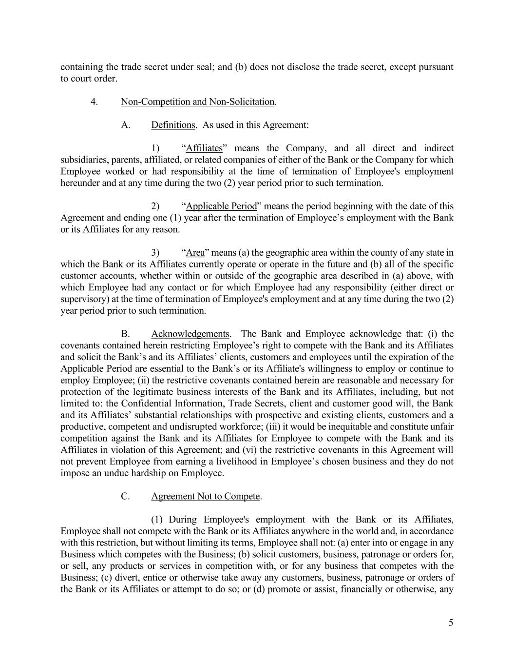 5 containing the trade secret under seal; and (b) does not disclose the trade secret, except pursuant to court order. 4. Non-Competition and Non-Solicitation. A. Definitions. As used in this Agreement: 1) “Affiliates” means the Company, and all direct and indirect subsidiaries, parents, affiliated, or related companies of either of the Bank or the Company for which Employee worked or had responsibility at the time of termination of Employee's employment hereunder and at any time during the two (2) year period prior to such termination. 2) “Applicable Period” means the period beginning with the date of this Agreement and ending one (1) year after the termination of Employee’s employment with the Bank or its Affiliates for any reason. 3) “Area” means (a) the geographic area within the county of any state in which the Bank or its Affiliates currently operate or operate in the future and (b) all of the specific customer accounts, whether within or outside of the geographic area described in (a) above, with which Employee had any contact or for which Employee had any responsibility (either direct or supervisory) at the time of termination of Employee's employment and at any time during the two (2) year period prior to such termination. B. Acknowledgements. The Bank and Employee acknowledge that: (i) the covenants contained herein restricting Employee’s right to compete with the Bank and its Affiliates and solicit the Bank’s and its Affiliates’ clients, customers and employees until the expiration of the Applicable Period are essential to the Bank’s or its Affiliate's willingness to employ or continue to employ Employee; (ii) the restrictive covenants contained herein are reasonable and necessary for protection of the legitimate business interests of the Bank and its Affiliates, including, but not limited to: the Confidential Information, Trade Secrets, client and customer good will, the Bank and its Affiliates’ substantial relationships with prospective and existing clients, customers and a productive, competent and undisrupted workforce; (iii) it would be inequitable and constitute unfair competition against the Bank and its Affiliates for Employee to compete with the Bank and its Affiliates in violation of this Agreement; and (vi) the restrictive covenants in this Agreement will not prevent Employee from earning a livelihood in Employee’s chosen business and they do not impose an undue hardship on Employee. C. Agreement Not to Compete. (1) During Employee's employment with the Bank or its Affiliates, Employee shall not compete with the Bank or its Affiliates anywhere in the world and, in accordance with this restriction, but without limiting its terms, Employee shall not: (a) enter into or engage in any Business which competes with the Business; (b) solicit customers, business, patronage or orders for, or sell, any products or services in competition with, or for any business that competes with the Business; (c) divert, entice or otherwise take away any customers, business, patronage or orders of the Bank or its Affiliates or attempt to do so; or (d) promote or assist, financially or otherwise, any