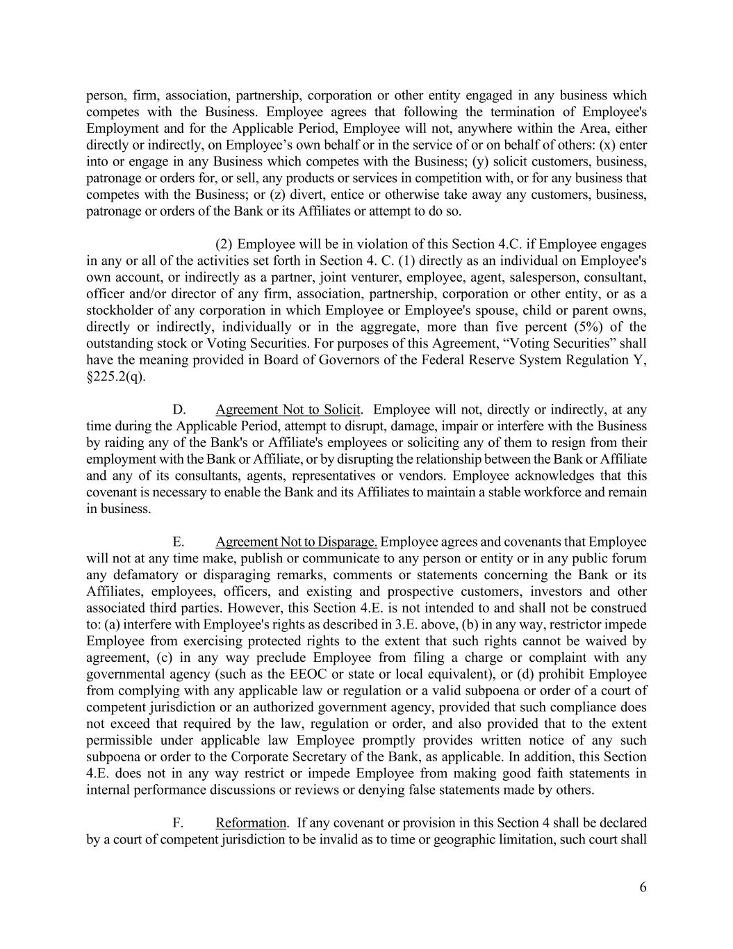 6 person, firm, association, partnership, corporation or other entity engaged in any business which competes with the Business. Employee agrees that following the termination of Employee's Employment and for the Applicable Period, Employee will not, anywhere within the Area, either directly or indirectly, on Employee’s own behalf or in the service of or on behalf of others: (x) enter into or engage in any Business which competes with the Business; (y) solicit customers, business, patronage or orders for, or sell, any products or services in competition with, or for any business that competes with the Business; or (z) divert, entice or otherwise take away any customers, business, patronage or orders of the Bank or its Affiliates or attempt to do so. (2) Employee will be in violation of this Section 4.C. if Employee engages in any or all of the activities set forth in Section 4. C. (1) directly as an individual on Employee's own account, or indirectly as a partner, joint venturer, employee, agent, salesperson, consultant, officer and/or director of any firm, association, partnership, corporation or other entity, or as a stockholder of any corporation in which Employee or Employee's spouse, child or parent owns, directly or indirectly, individually or in the aggregate, more than five percent (5%) of the outstanding stock or Voting Securities. For purposes of this Agreement, “Voting Securities” shall have the meaning provided in Board of Governors of the Federal Reserve System Regulation Y, §225.2(q). D. Agreement Not to Solicit. Employee will not, directly or indirectly, at any time during the Applicable Period, attempt to disrupt, damage, impair or interfere with the Business by raiding any of the Bank's or Affiliate's employees or soliciting any of them to resign from their employment with the Bank or Affiliate, or by disrupting the relationship between the Bank or Affiliate and any of its consultants, agents, representatives or vendors. Employee acknowledges that this covenant is necessary to enable the Bank and its Affiliates to maintain a stable workforce and remain in business. E. Agreement Not to Disparage. Employee agrees and covenants that Employee will not at any time make, publish or communicate to any person or entity or in any public forum any defamatory or disparaging remarks, comments or statements concerning the Bank or its Affiliates, employees, officers, and existing and prospective customers, investors and other associated third parties. However, this Section 4.E. is not intended to and shall not be construed to: (a) interfere with Employee's rights as described in 3.E. above, (b) in any way, restrictor impede Employee from exercising protected rights to the extent that such rights cannot be waived by agreement, (c) in any way preclude Employee from filing a charge or complaint with any governmental agency (such as the EEOC or state or local equivalent), or (d) prohibit Employee from complying with any applicable law or regulation or a valid subpoena or order of a court of competent jurisdiction or an authorized government agency, provided that such compliance does not exceed that required by the law, regulation or order, and also provided that to the extent permissible under applicable law Employee promptly provides written notice of any such subpoena or order to the Corporate Secretary of the Bank, as applicable. In addition, this Section 4.E. does not in any way restrict or impede Employee from making good faith statements in internal performance discussions or reviews or denying false statements made by others. F. Reformation. If any covenant or provision in this Section 4 shall be declared by a court of competent jurisdiction to be invalid as to time or geographic limitation, such court shall
