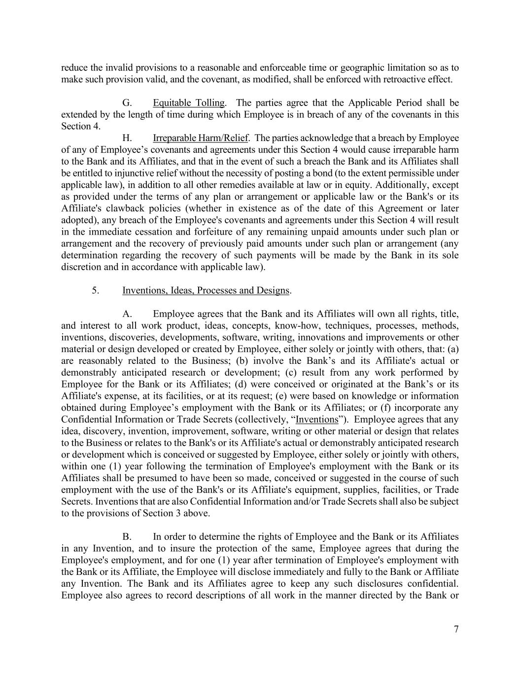 7 reduce the invalid provisions to a reasonable and enforceable time or geographic limitation so as to make such provision valid, and the covenant, as modified, shall be enforced with retroactive effect. G. Equitable Tolling. The parties agree that the Applicable Period shall be extended by the length of time during which Employee is in breach of any of the covenants in this Section 4. H. Irreparable Harm/Relief. The parties acknowledge that a breach by Employee of any of Employee’s covenants and agreements under this Section 4 would cause irreparable harm to the Bank and its Affiliates, and that in the event of such a breach the Bank and its Affiliates shall be entitled to injunctive relief without the necessity of posting a bond (to the extent permissible under applicable law), in addition to all other remedies available at law or in equity. Additionally, except as provided under the terms of any plan or arrangement or applicable law or the Bank's or its Affiliate's clawback policies (whether in existence as of the date of this Agreement or later adopted), any breach of the Employee's covenants and agreements under this Section 4 will result in the immediate cessation and forfeiture of any remaining unpaid amounts under such plan or arrangement and the recovery of previously paid amounts under such plan or arrangement (any determination regarding the recovery of such payments will be made by the Bank in its sole discretion and in accordance with applicable law). 5. Inventions, Ideas, Processes and Designs. A. Employee agrees that the Bank and its Affiliates will own all rights, title, and interest to all work product, ideas, concepts, know-how, techniques, processes, methods, inventions, discoveries, developments, software, writing, innovations and improvements or other material or design developed or created by Employee, either solely or jointly with others, that: (a) are reasonably related to the Business; (b) involve the Bank’s and its Affiliate's actual or demonstrably anticipated research or development; (c) result from any work performed by Employee for the Bank or its Affiliates; (d) were conceived or originated at the Bank’s or its Affiliate's expense, at its facilities, or at its request; (e) were based on knowledge or information obtained during Employee’s employment with the Bank or its Affiliates; or (f) incorporate any Confidential Information or Trade Secrets (collectively, “Inventions”). Employee agrees that any idea, discovery, invention, improvement, software, writing or other material or design that relates to the Business or relates to the Bank's or its Affiliate's actual or demonstrably anticipated research or development which is conceived or suggested by Employee, either solely or jointly with others, within one (1) year following the termination of Employee's employment with the Bank or its Affiliates shall be presumed to have been so made, conceived or suggested in the course of such employment with the use of the Bank's or its Affiliate's equipment, supplies, facilities, or Trade Secrets. Inventions that are also Confidential Information and/or Trade Secrets shall also be subject to the provisions of Section 3 above. B. In order to determine the rights of Employee and the Bank or its Affiliates in any Invention, and to insure the protection of the same, Employee agrees that during the Employee's employment, and for one (1) year after termination of Employee's employment with the Bank or its Affiliate, the Employee will disclose immediately and fully to the Bank or Affiliate any Invention. The Bank and its Affiliates agree to keep any such disclosures confidential. Employee also agrees to record descriptions of all work in the manner directed by the Bank or