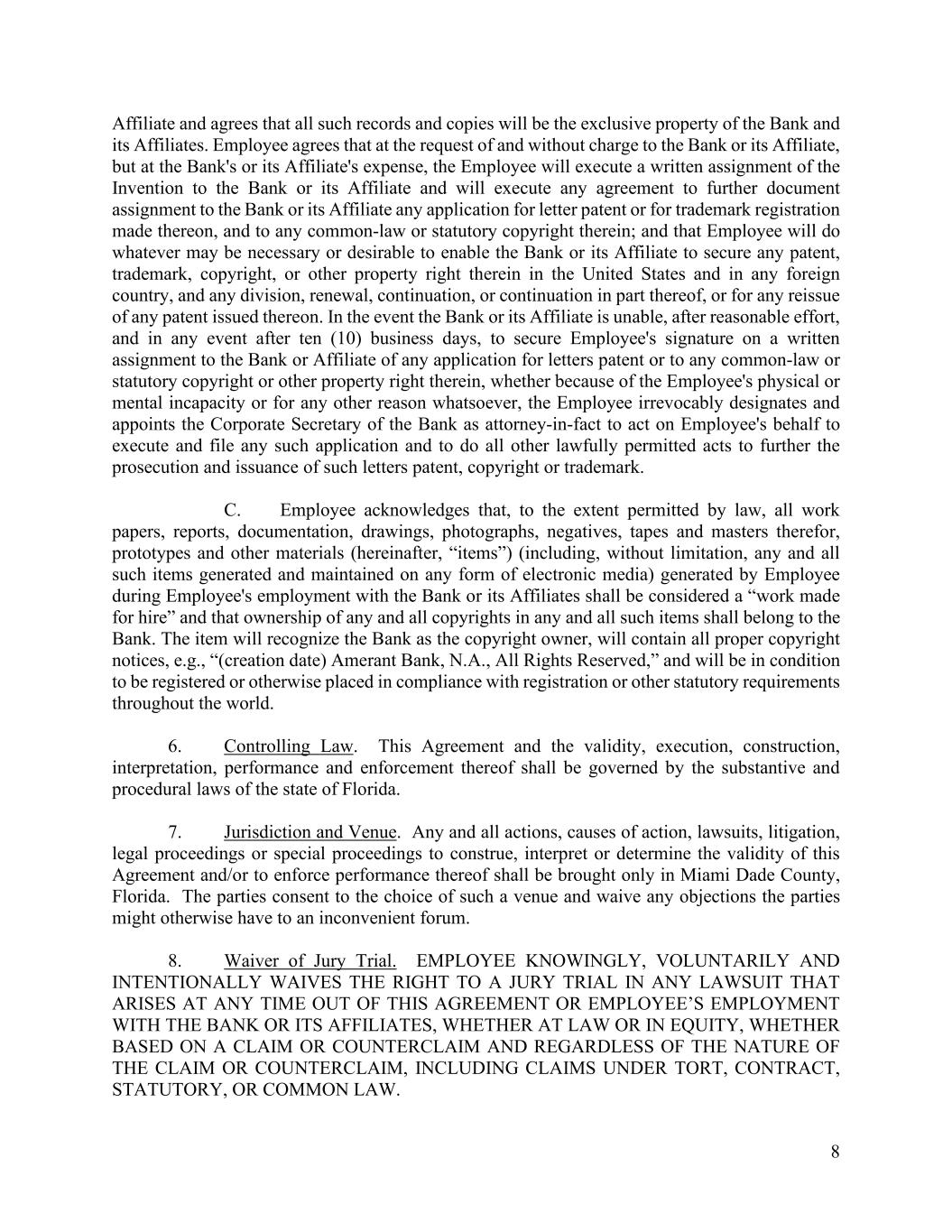 8 Affiliate and agrees that all such records and copies will be the exclusive property of the Bank and its Affiliates. Employee agrees that at the request of and without charge to the Bank or its Affiliate, but at the Bank's or its Affiliate's expense, the Employee will execute a written assignment of the Invention to the Bank or its Affiliate and will execute any agreement to further document assignment to the Bank or its Affiliate any application for letter patent or for trademark registration made thereon, and to any common-law or statutory copyright therein; and that Employee will do whatever may be necessary or desirable to enable the Bank or its Affiliate to secure any patent, trademark, copyright, or other property right therein in the United States and in any foreign country, and any division, renewal, continuation, or continuation in part thereof, or for any reissue of any patent issued thereon. In the event the Bank or its Affiliate is unable, after reasonable effort, and in any event after ten (10) business days, to secure Employee's signature on a written assignment to the Bank or Affiliate of any application for letters patent or to any common-law or statutory copyright or other property right therein, whether because of the Employee's physical or mental incapacity or for any other reason whatsoever, the Employee irrevocably designates and appoints the Corporate Secretary of the Bank as attorney-in-fact to act on Employee's behalf to execute and file any such application and to do all other lawfully permitted acts to further the prosecution and issuance of such letters patent, copyright or trademark. C. Employee acknowledges that, to the extent permitted by law, all work papers, reports, documentation, drawings, photographs, negatives, tapes and masters therefor, prototypes and other materials (hereinafter, “items”) (including, without limitation, any and all such items generated and maintained on any form of electronic media) generated by Employee during Employee's employment with the Bank or its Affiliates shall be considered a “work made for hire” and that ownership of any and all copyrights in any and all such items shall belong to the Bank. The item will recognize the Bank as the copyright owner, will contain all proper copyright notices, e.g., “(creation date) Amerant Bank, N.A., All Rights Reserved,” and will be in condition to be registered or otherwise placed in compliance with registration or other statutory requirements throughout the world. 6. Controlling Law. This Agreement and the validity, execution, construction, interpretation, performance and enforcement thereof shall be governed by the substantive and procedural laws of the state of Florida. 7. Jurisdiction and Venue. Any and all actions, causes of action, lawsuits, litigation, legal proceedings or special proceedings to construe, interpret or determine the validity of this Agreement and/or to enforce performance thereof shall be brought only in Miami Dade County, Florida. The parties consent to the choice of such a venue and waive any objections the parties might otherwise have to an inconvenient forum. 8. Waiver of Jury Trial. EMPLOYEE KNOWINGLY, VOLUNTARILY AND INTENTIONALLY WAIVES THE RIGHT TO A JURY TRIAL IN ANY LAWSUIT THAT ARISES AT ANY TIME OUT OF THIS AGREEMENT OR EMPLOYEE’S EMPLOYMENT WITH THE BANK OR ITS AFFILIATES, WHETHER AT LAW OR IN EQUITY, WHETHER BASED ON A CLAIM OR COUNTERCLAIM AND REGARDLESS OF THE NATURE OF THE CLAIM OR COUNTERCLAIM, INCLUDING CLAIMS UNDER TORT, CONTRACT, STATUTORY, OR COMMON LAW.