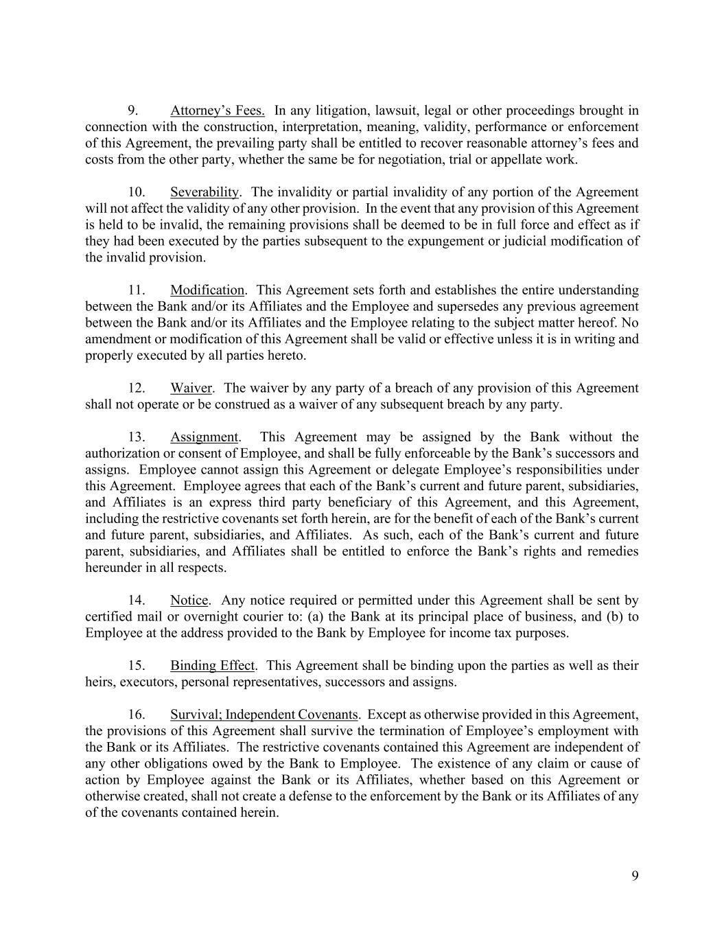 9 9. Attorney’s Fees. In any litigation, lawsuit, legal or other proceedings brought in connection with the construction, interpretation, meaning, validity, performance or enforcement of this Agreement, the prevailing party shall be entitled to recover reasonable attorney’s fees and costs from the other party, whether the same be for negotiation, trial or appellate work. 10. Severability. The invalidity or partial invalidity of any portion of the Agreement will not affect the validity of any other provision. In the event that any provision of this Agreement is held to be invalid, the remaining provisions shall be deemed to be in full force and effect as if they had been executed by the parties subsequent to the expungement or judicial modification of the invalid provision. 11. Modification. This Agreement sets forth and establishes the entire understanding between the Bank and/or its Affiliates and the Employee and supersedes any previous agreement between the Bank and/or its Affiliates and the Employee relating to the subject matter hereof. No amendment or modification of this Agreement shall be valid or effective unless it is in writing and properly executed by all parties hereto. 12. Waiver. The waiver by any party of a breach of any provision of this Agreement shall not operate or be construed as a waiver of any subsequent breach by any party. 13. Assignment. This Agreement may be assigned by the Bank without the authorization or consent of Employee, and shall be fully enforceable by the Bank’s successors and assigns. Employee cannot assign this Agreement or delegate Employee’s responsibilities under this Agreement. Employee agrees that each of the Bank’s current and future parent, subsidiaries, and Affiliates is an express third party beneficiary of this Agreement, and this Agreement, including the restrictive covenants set forth herein, are for the benefit of each of the Bank’s current and future parent, subsidiaries, and Affiliates. As such, each of the Bank’s current and future parent, subsidiaries, and Affiliates shall be entitled to enforce the Bank’s rights and remedies hereunder in all respects. 14. Notice. Any notice required or permitted under this Agreement shall be sent by certified mail or overnight courier to: (a) the Bank at its principal place of business, and (b) to Employee at the address provided to the Bank by Employee for income tax purposes. 15. Binding Effect. This Agreement shall be binding upon the parties as well as their heirs, executors, personal representatives, successors and assigns. 16. Survival; Independent Covenants. Except as otherwise provided in this Agreement, the provisions of this Agreement shall survive the termination of Employee’s employment with the Bank or its Affiliates. The restrictive covenants contained this Agreement are independent of any other obligations owed by the Bank to Employee. The existence of any claim or cause of action by Employee against the Bank or its Affiliates, whether based on this Agreement or otherwise created, shall not create a defense to the enforcement by the Bank or its Affiliates of any of the covenants contained herein.