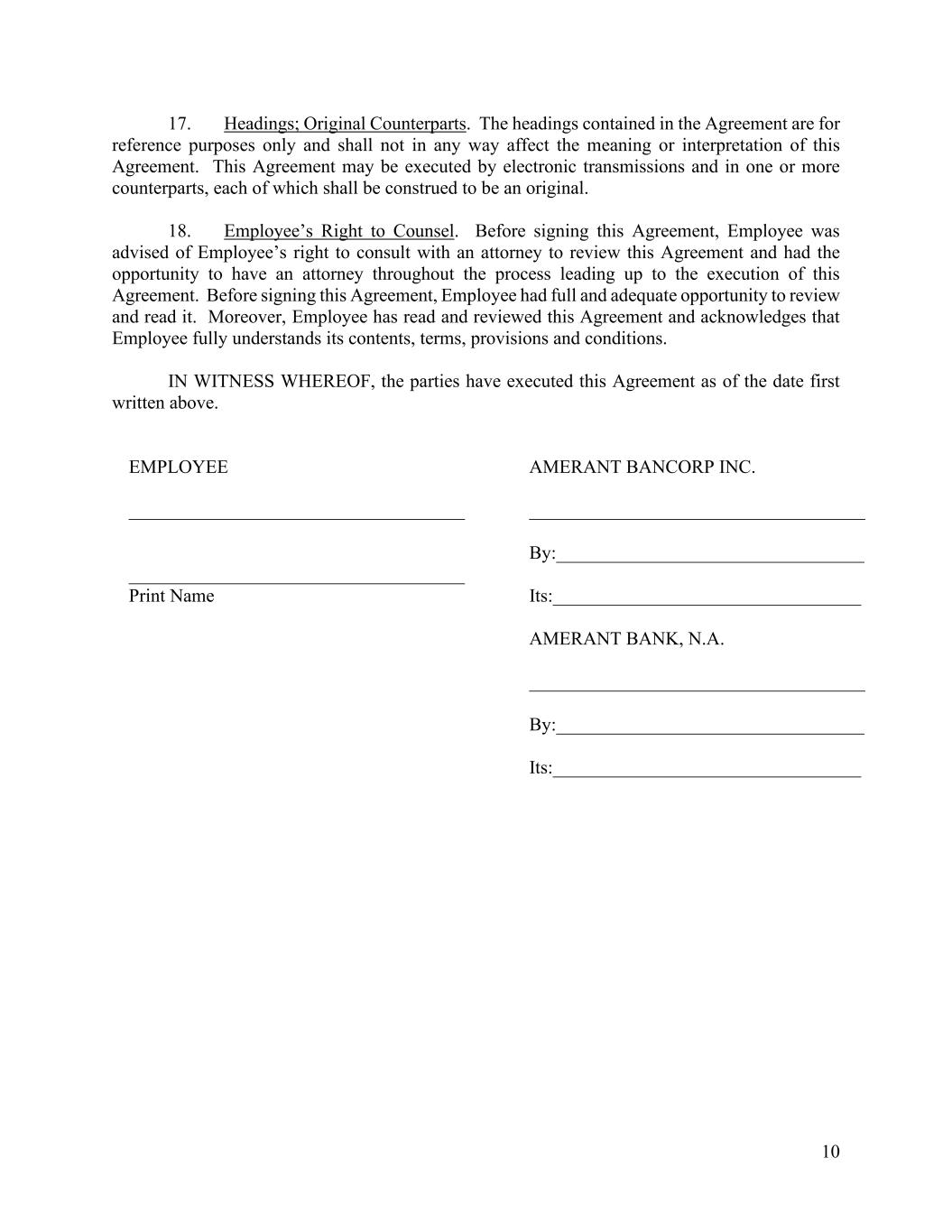 10 17. Headings; Original Counterparts. The headings contained in the Agreement are for reference purposes only and shall not in any way affect the meaning or interpretation of this Agreement. This Agreement may be executed by electronic transmissions and in one or more counterparts, each of which shall be construed to be an original. 18. Employee’s Right to Counsel. Before signing this Agreement, Employee was advised of Employee’s right to consult with an attorney to review this Agreement and had the opportunity to have an attorney throughout the process leading up to the execution of this Agreement. Before signing this Agreement, Employee had full and adequate opportunity to review and read it. Moreover, Employee has read and reviewed this Agreement and acknowledges that Employee fully understands its contents, terms, provisions and conditions. IN WITNESS WHEREOF, the parties have executed this Agreement as of the date first written above. EMPLOYEE ____________________________________ ____________________________________ Print Name AMERANT BANCORP INC. ____________________________________ By:_________________________________ Its:_________________________________ AMERANT BANK, N.A. ____________________________________ By:_________________________________ Its:_________________________________