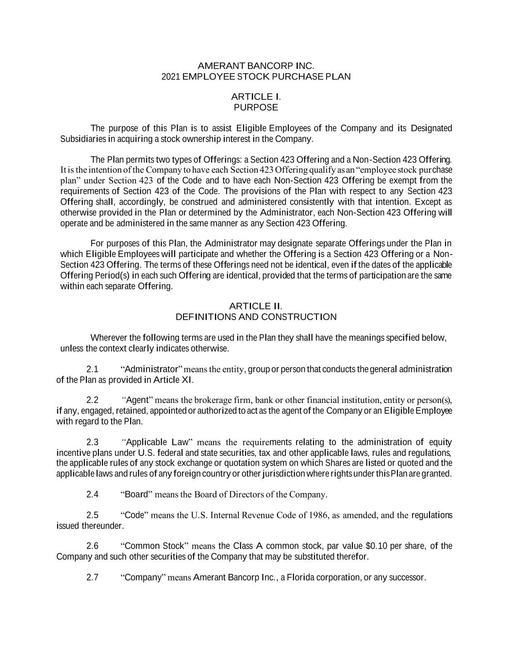AMERANT BANCORP INC. 2021 EMPLOYEE STOCK PURCHASE PLAN ARTICLE I. PURPOSE The purpose of this Plan is to assist Eligible Employees of the Company and its Designated Subsidiaries in acquiring a stock ownership interest in the Company. The Plan permits two types of Offerings: a Section 423 Offering and a Non-Section 423 Offering. It is the intention of the Company to have each Section 423 Offering qualify as an “employee stock purchase plan” under Section 423 of the Code and to have each Non-Section 423 Offering be exempt from the requirements of Section 423 of the Code. The provisions of the Plan with respect to any Section 423 Offering shall, accordingly, be construed and administered consistently with that intention. Except as otherwise provided in the Plan or determined by the Administrator, each Non-Section 423 Offering will operate and be administered in the same manner as any Section 423 Offering. For purposes of this Plan, the Administrator may designate separate Offerings under the Plan in which Eligible Employees will participate and whether the Offering is a Section 423 Offering or a Non- Section 423 Offering. The terms of these Offerings need not be identical, even if the dates of the applicable Offering Period(s) in each such Offering are identical, provided that the terms of participation are the same within each separate Offering. ARTICLE II. DEFINITIONS AND CONSTRUCTION Wherever the following terms are used in the Plan they shall have the meanings specified below, unless the context clearly indicates otherwise. 2.1 “Administrator” means the entity, group or person that conducts the general administration of the Plan as provided in Article XI. 2.2 “Agent” means the brokerage firm, bank or other financial institution, entity or person(s), if any, engaged, retained, appointed or authorized to act as the agent of the Company or an Eligible Employee with regard to the Plan. 2.3 “Applicable Law” means the requirements relating to the administration of equity incentive plans under U.S. federal and state securities, tax and other applicable laws, rules and regulations, the applicable rules of any stock exchange or quotation system on which Shares are listed or quoted and the applicable laws and rules of any foreign country or other jurisdiction where rights under this Plan are granted. 2.4 “Board” means the Board of Directors of the Company. 2.5 “Code” means the U.S. Internal Revenue Code of 1986, as amended, and the regulations issued thereunder. 2.6 “Common Stock” means the Class A common stock, par value $0.10 per share, of the Company and such other securities of the Company that may be substituted therefor. 2.7 “Company” means Amerant Bancorp Inc., a Florida corporation, or any successor.